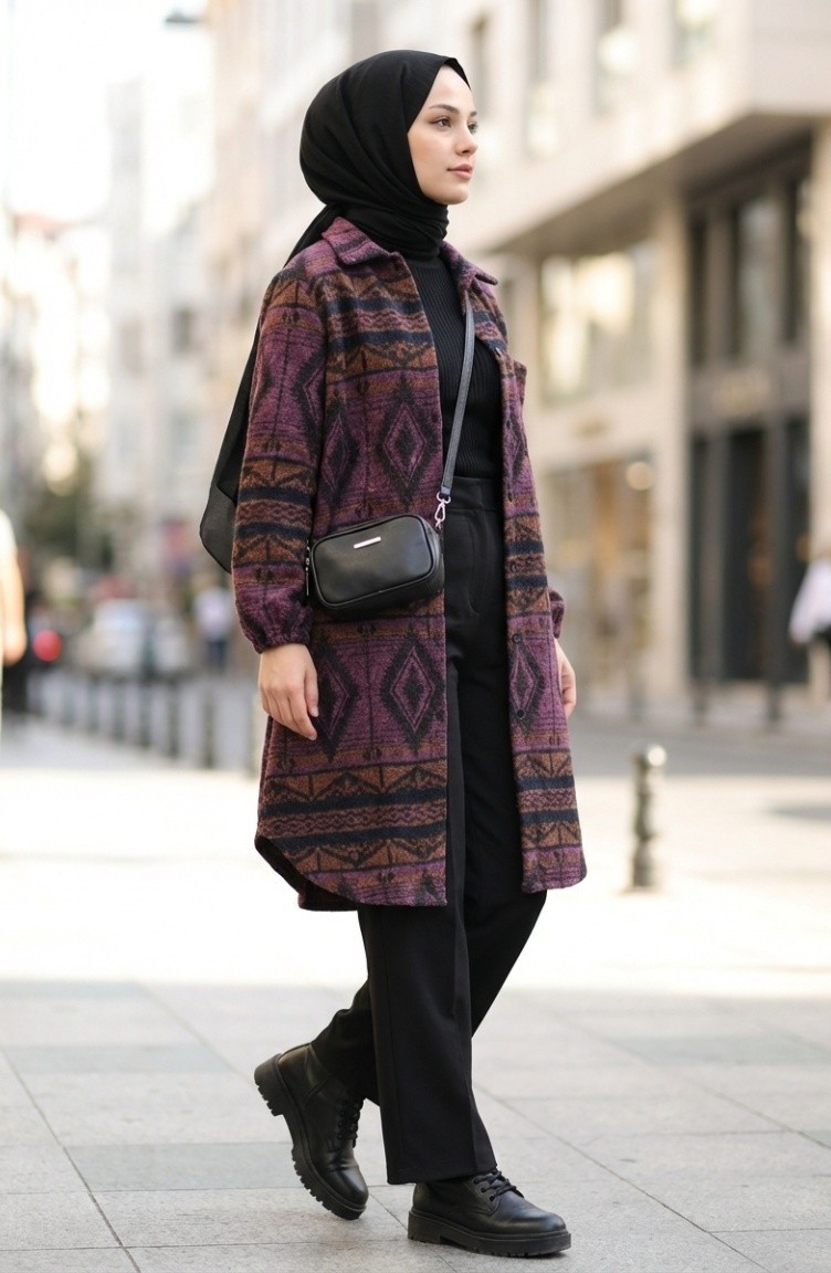 Etnik Desenli Düğmeli Kışlık Kap 2500-01 Mor Kiremit