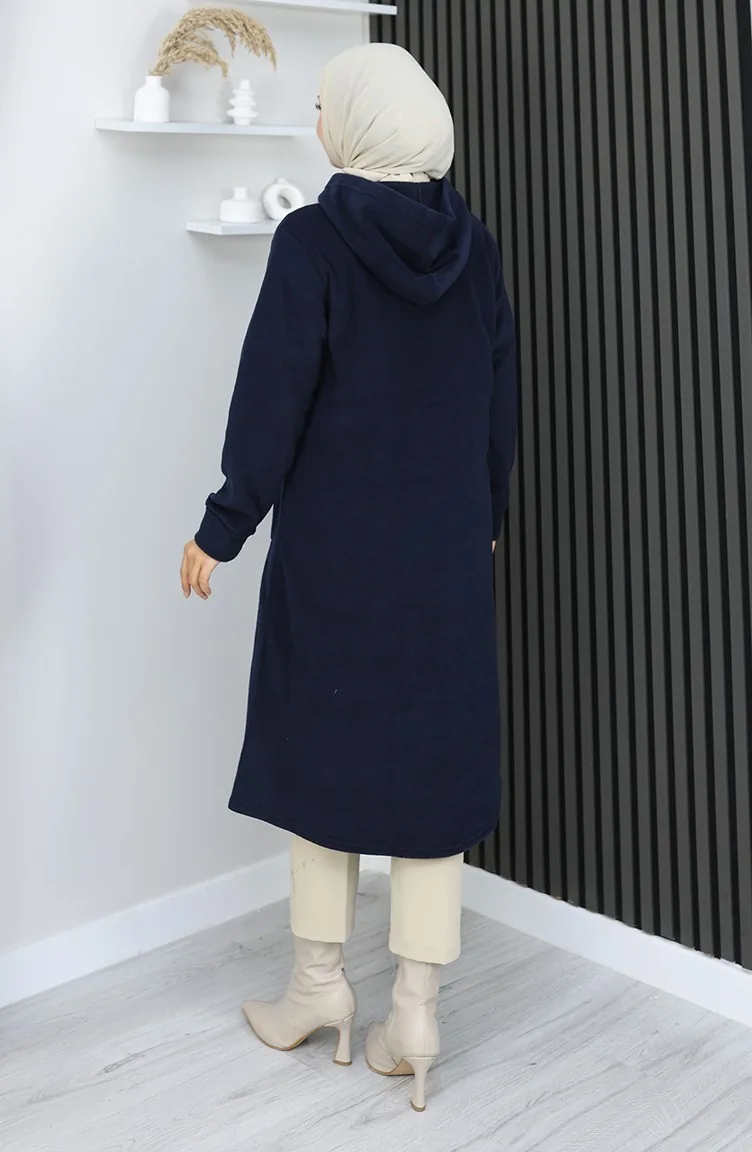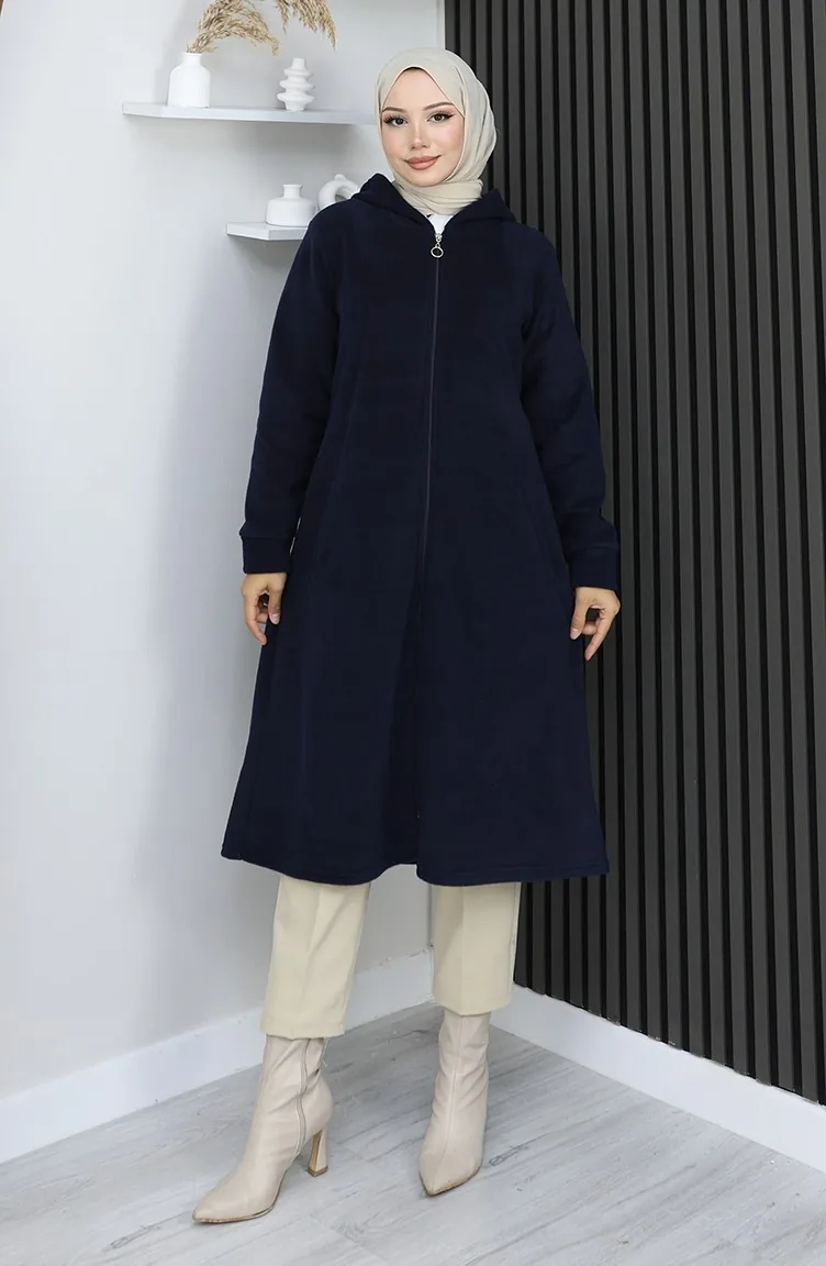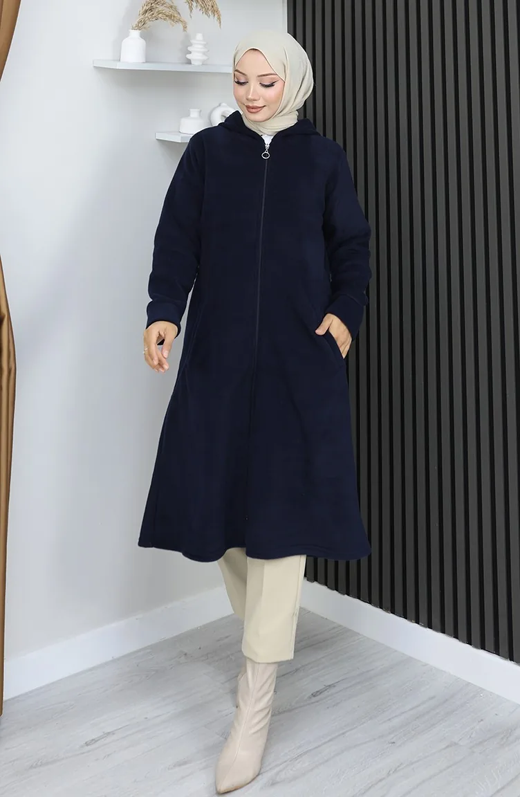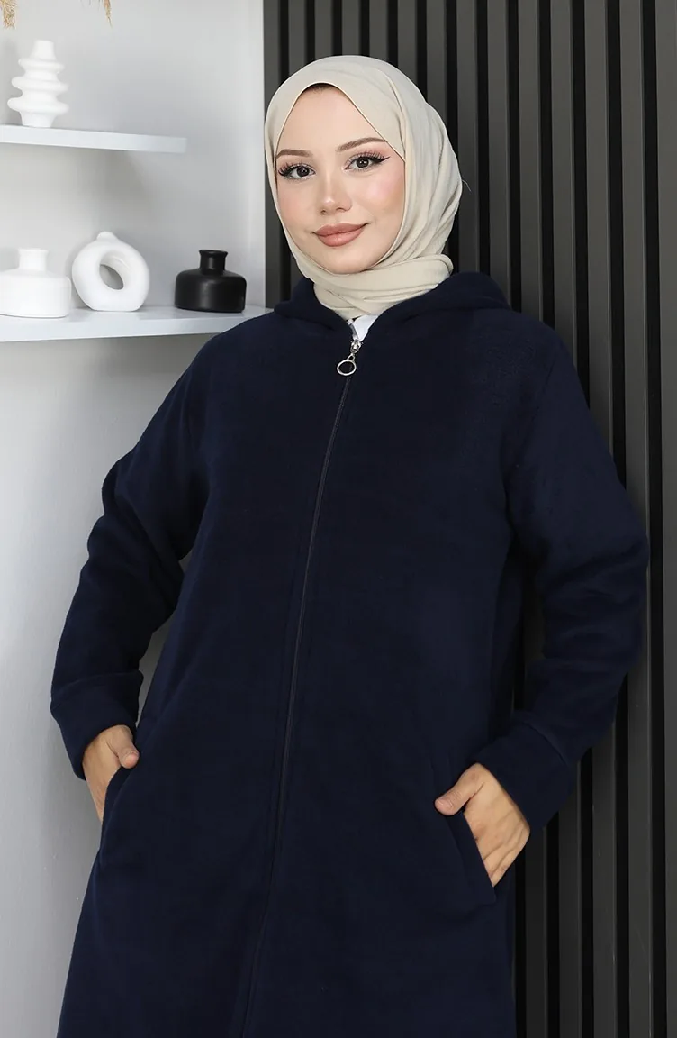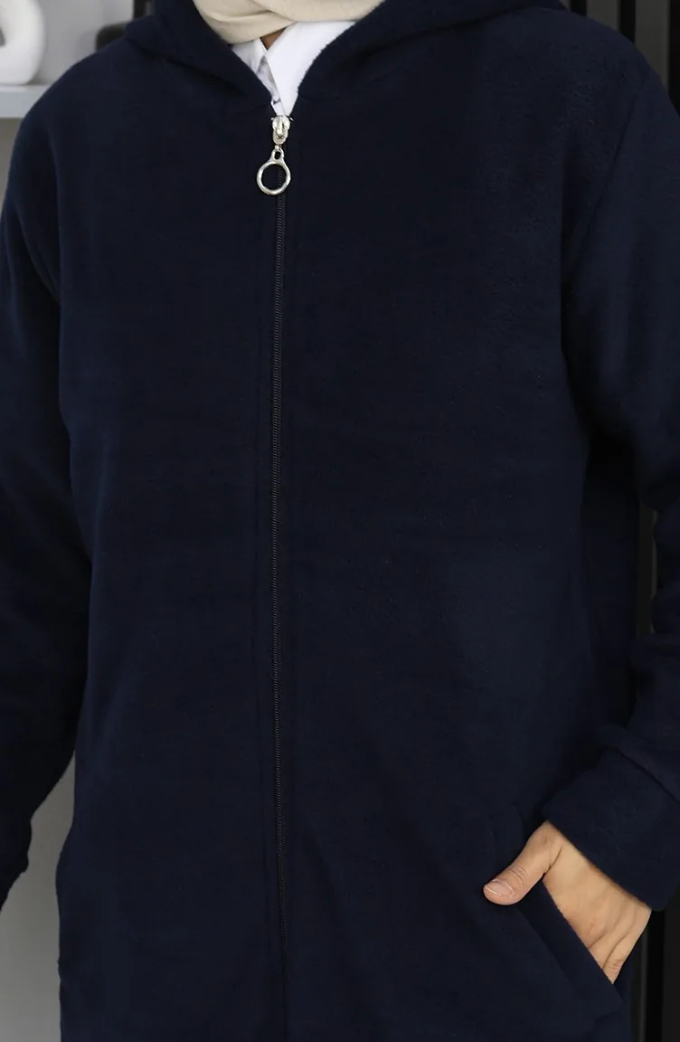 Lacivert renktedir. Polar kumaş. Sade. Kapüşonlu. Kışlık. Standart.
