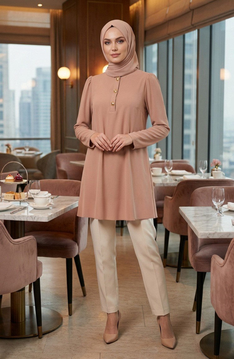İlkbahar ve yaz aylarının vazgeçilmezi olacak bu gül kurusu tunik, modern tesettür giyim çizgisini şıklıkla birleştiriyor. Nefes alabilen aerobin kumaş yapısı sayesinde en sıcak günlerde bile ferah bir kullanım sunan ürünümüz, gün boyu konforunuzdan ödün vermeden şık görünmenizi sağlar.Kumaş Özelliği: Yüksek kaliteli, terletmeyen ve kolay kırışmayan aerobin kumaştan üretilmiştir.Tasarım Detayları: Ön kısmındaki zarif düğme detayları ve hakim yaka kesimiyle hem günlük hem de ofis şıklığı için idealdir.Kalıp ve Uyum: Rahat kesimi sayesinde vücut hatlarını belli etmez, hareket özgürlüğü sağlar.Kombin Önerisi: Beyaz geniş paça pantolon ve kemik rengi bir şal ile kombinleyerek çabasız bir zarafet yakalayabilirsiniz.Muhafazakar giyim tarzını benimseyen kadınlar için özel olarak tasarlanan bu parça, gardırobunuzun en joker elemanı olmaya aday. Dayanıklı dikiş yapısı ve solmayan renk kalitesiyle uzun ömürlü kullanım imkanı tanır.