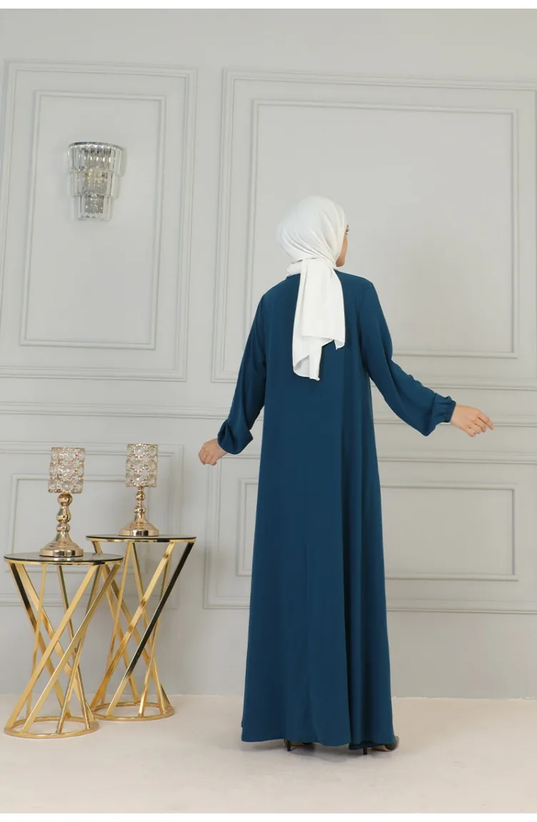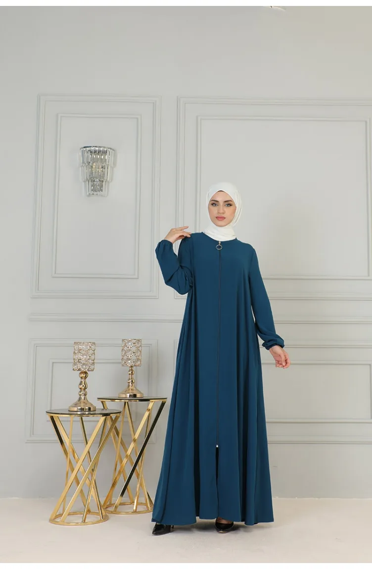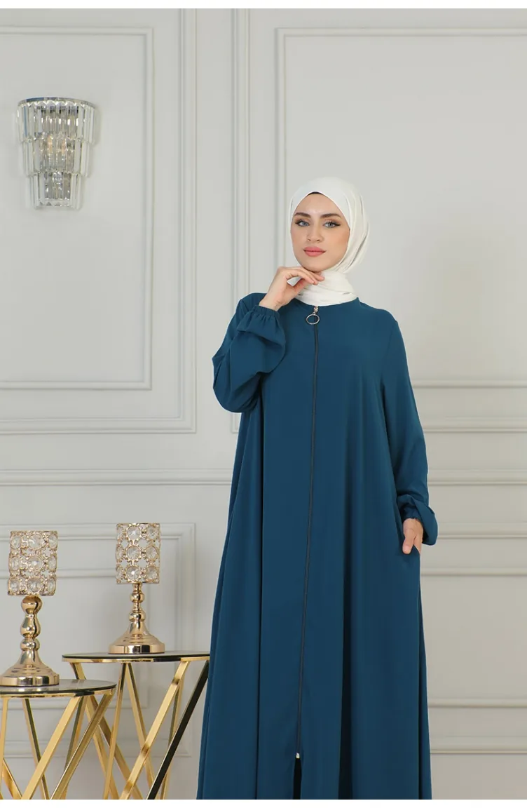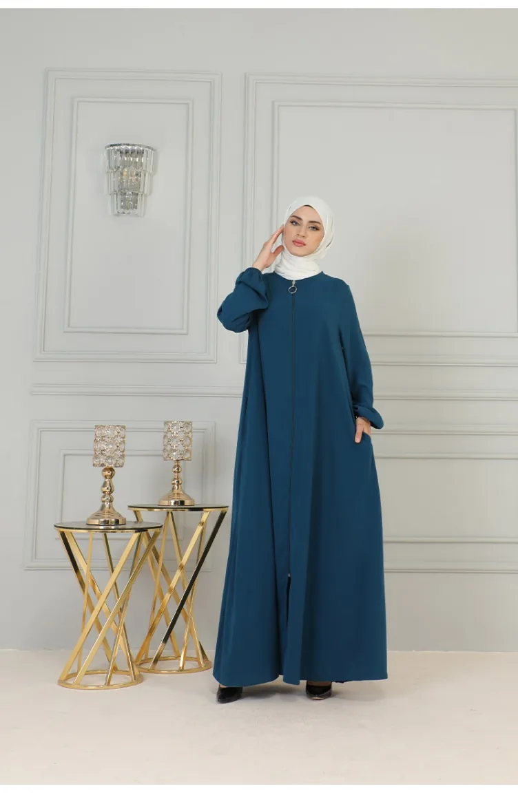 Boydan Fermuarlı Medine İpeği Ferace 2305-04 Petrol