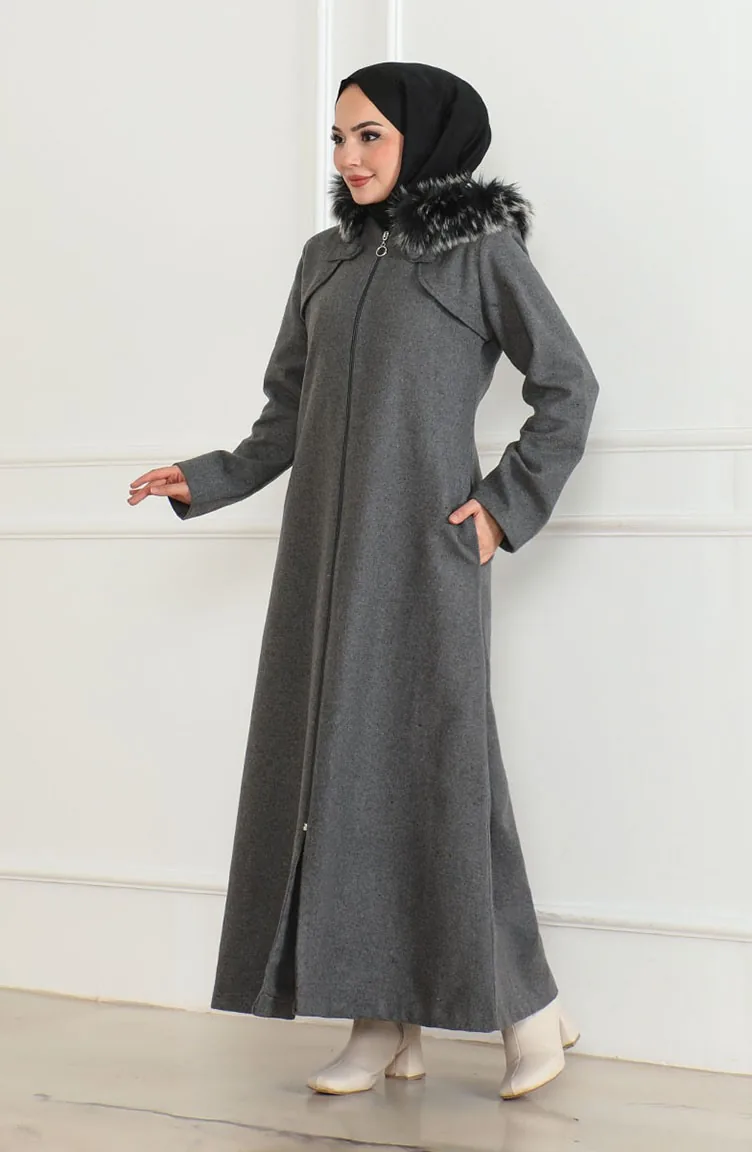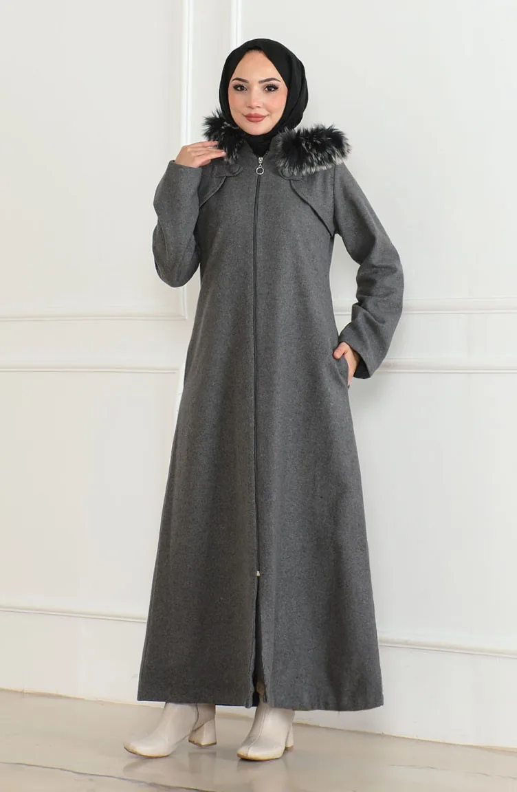 Kapüşonlu Kürklü Kaban 2058-08 Gri