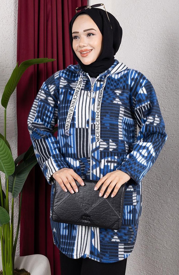 Indigo color is used. Polar fabric is used. Designed with patterned fabric. Zipper is used for easy handling. Designed from thick fabric. The size worn by the model, is the one on the image.