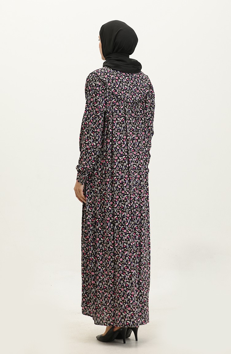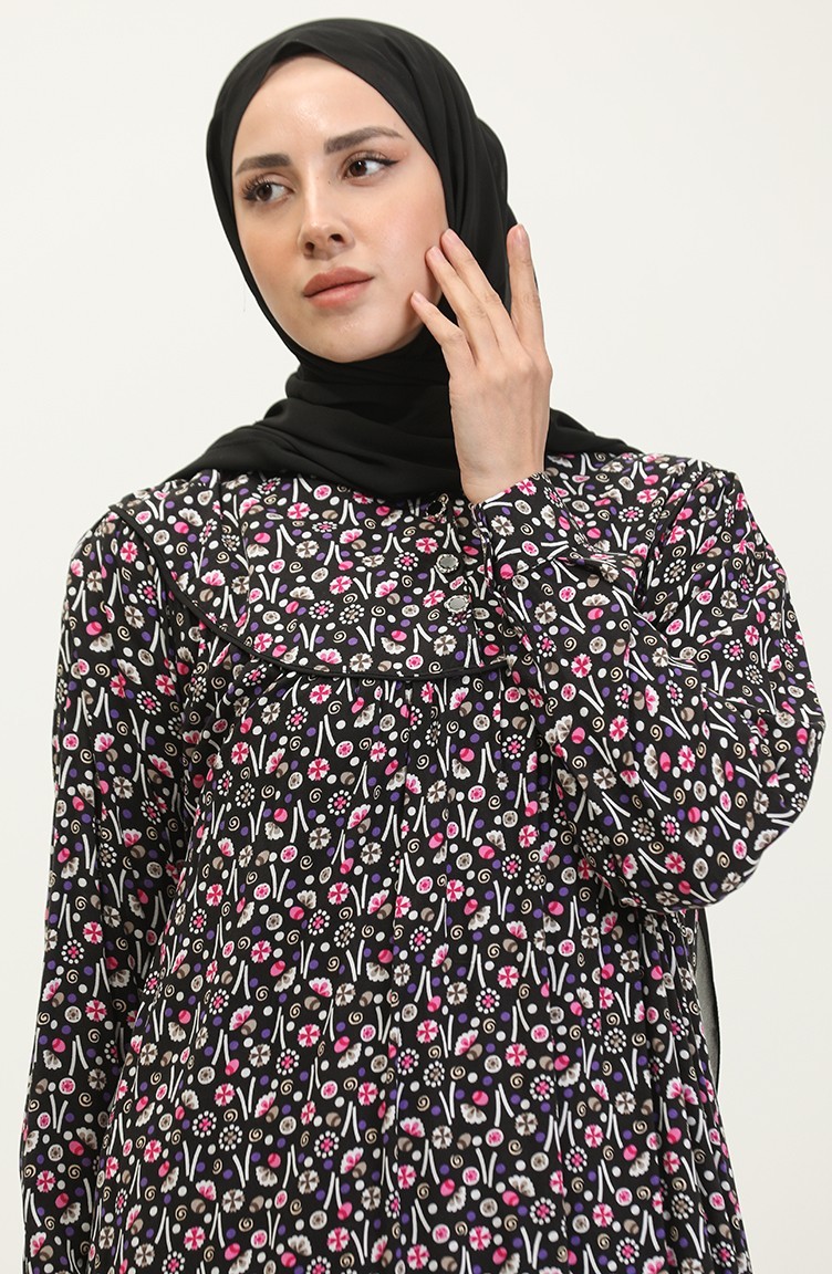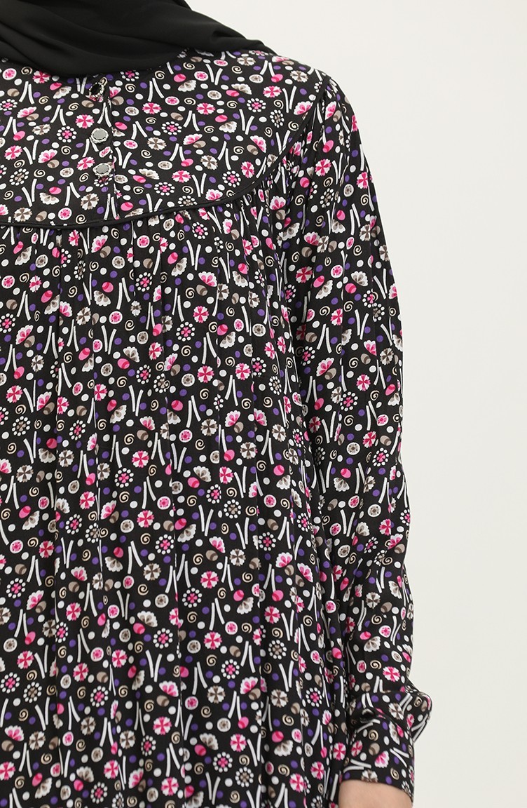 Black color is used. Viscose is a type of synthetic fabric and is convenient to use. Designed with patterned fabric. The product is used unlined. The detail of the sleeves is buttoned. The Zero collar is preferred for all types of clothing. Suitable for 4 seasons. Plus size option available.