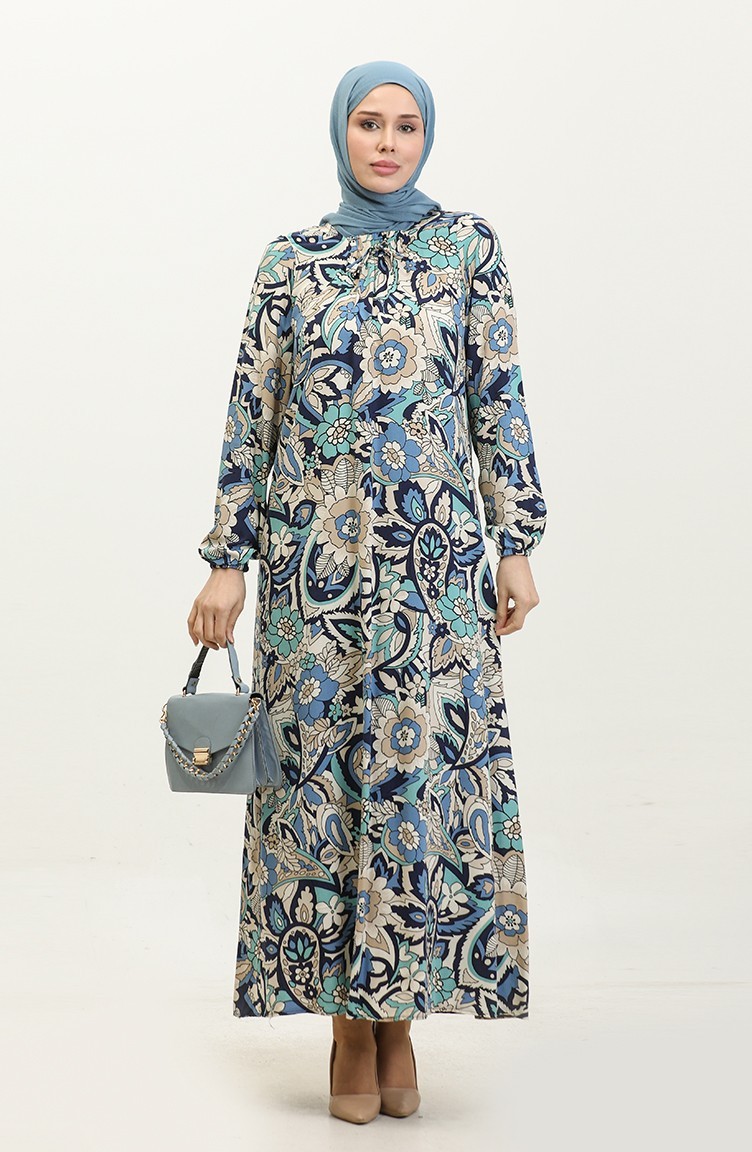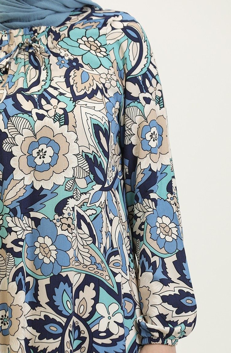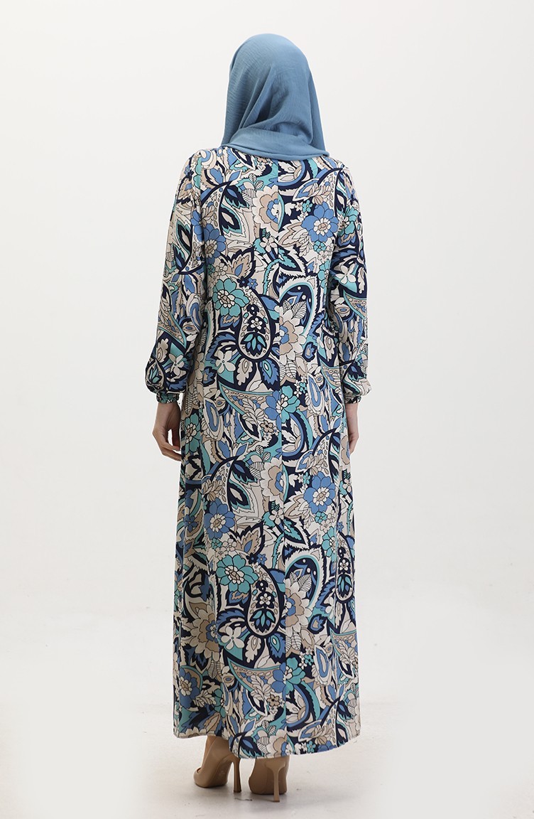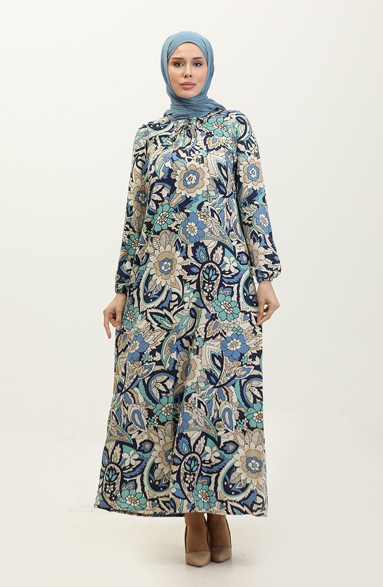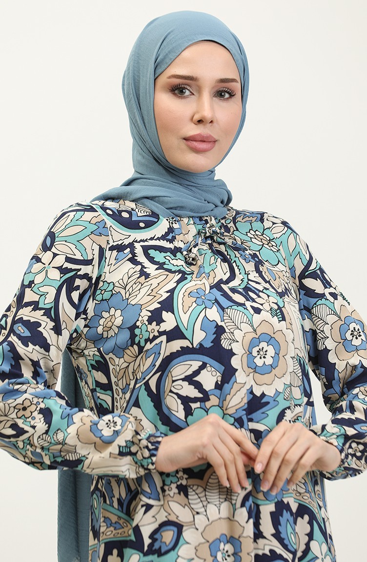 Indigo color is used. Viscose is a type of synthetic fabric and is convenient to use. Designed with patterned fabric. The product is used unlined. It's made of elastic sleeves. The Zero collar is preferred for all types of clothing. Suitable for 4 seasons. Plus size option available.