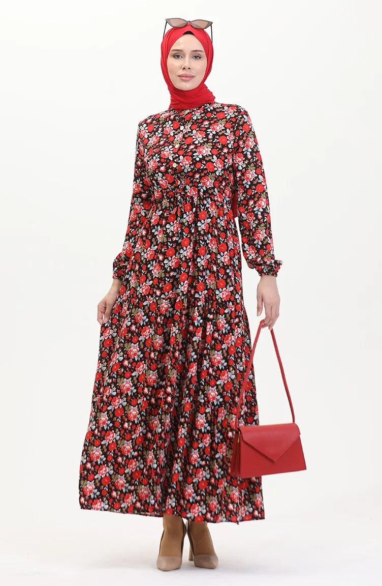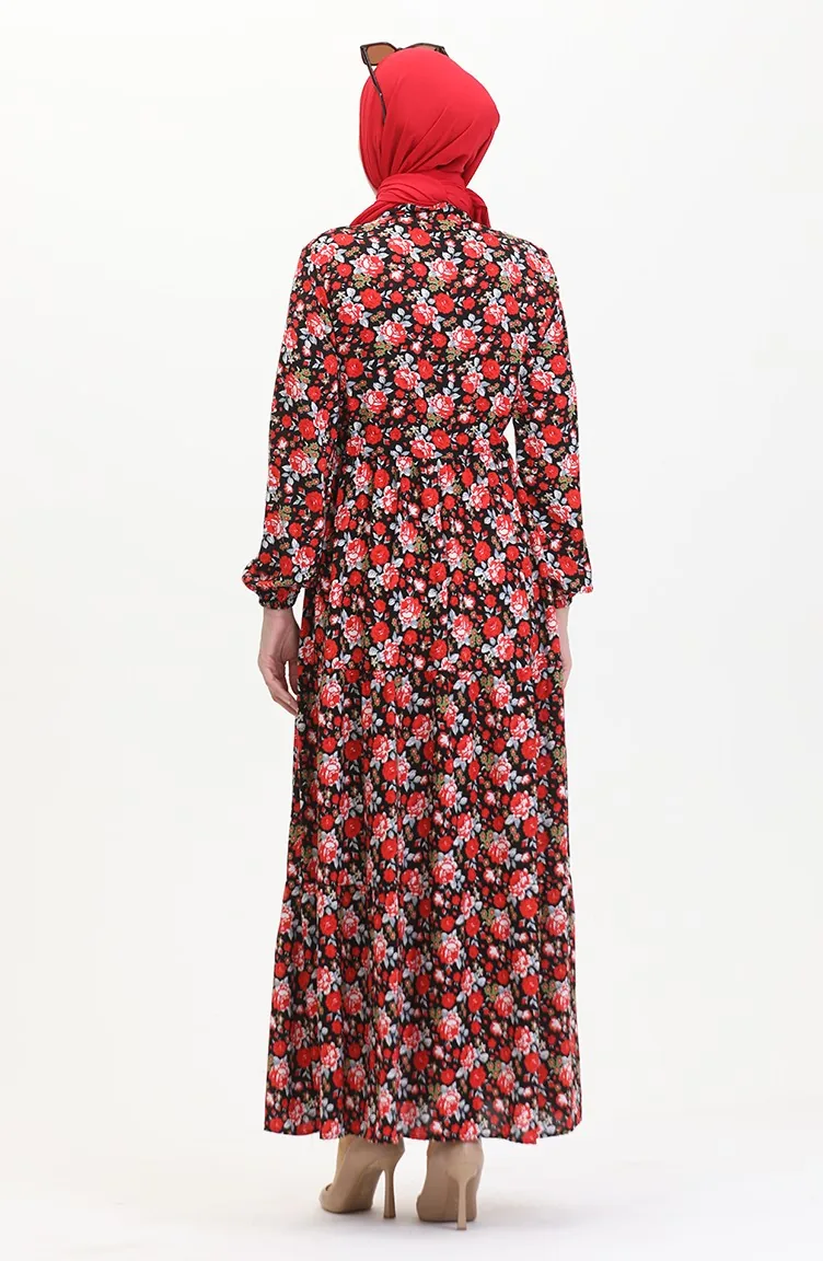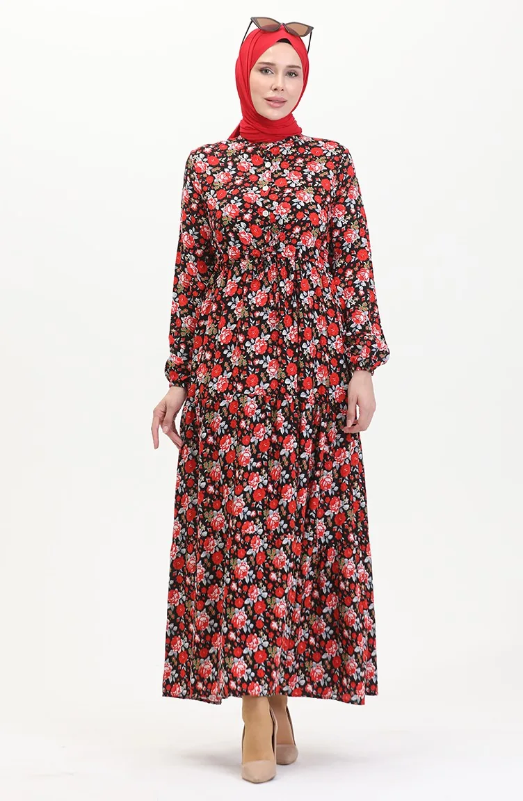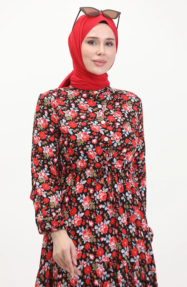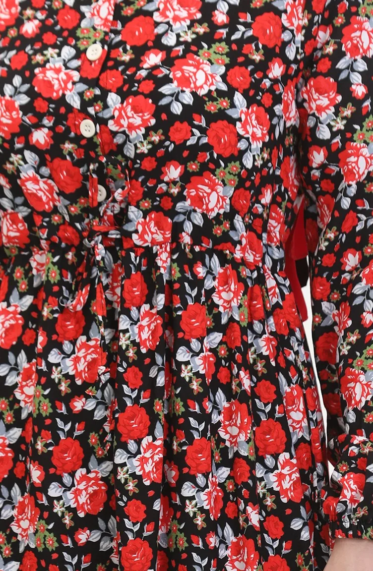 Viscose-jurk Met Patroon En Kant In De Taille 0488-01 Rood Zwart 0488-01