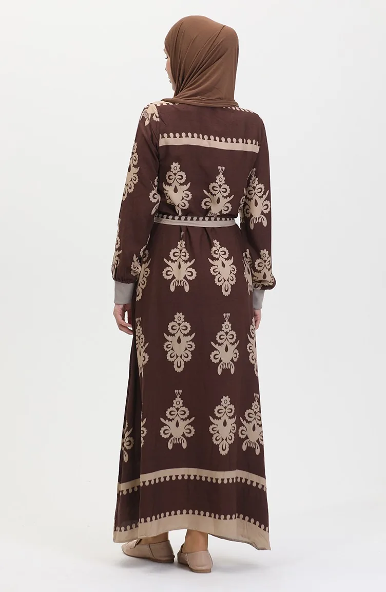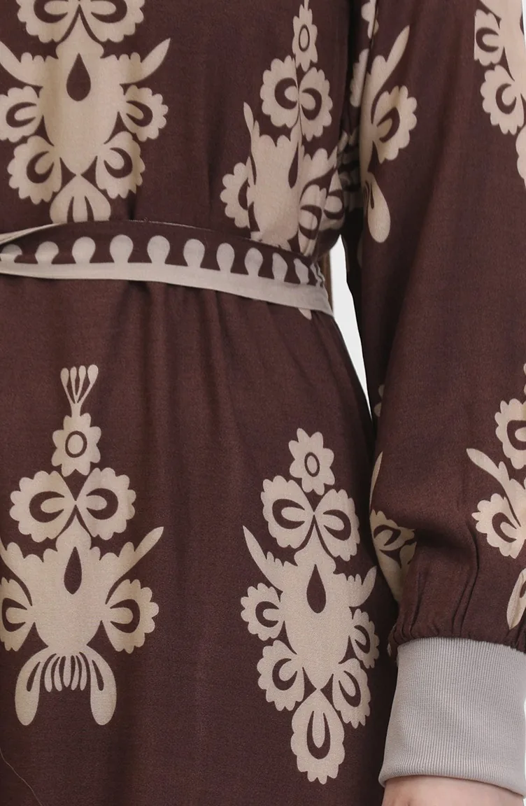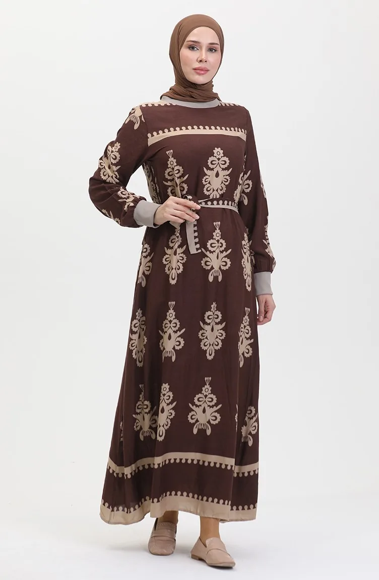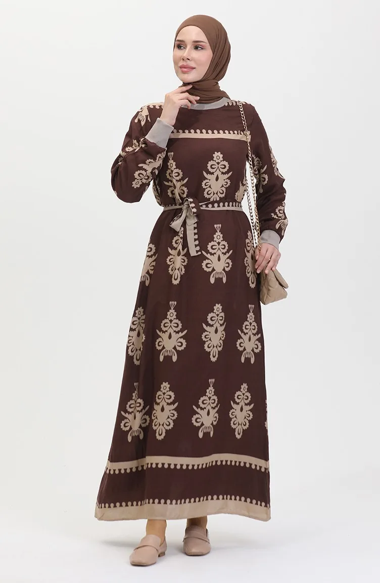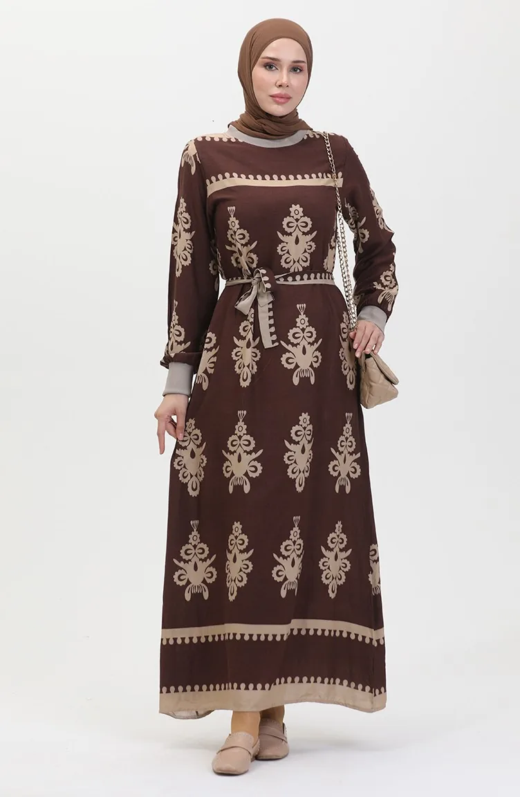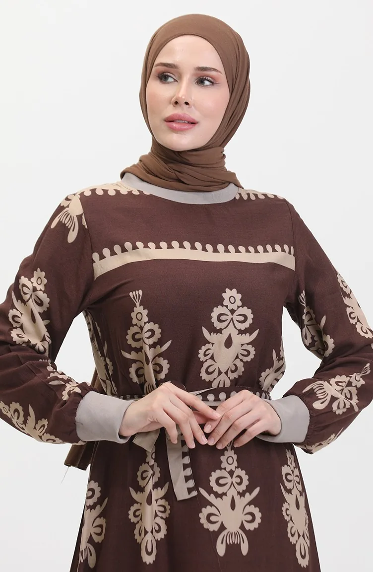Viscose-jurk Met Patroon En Riem 0443-03 Bruin 0443-03