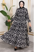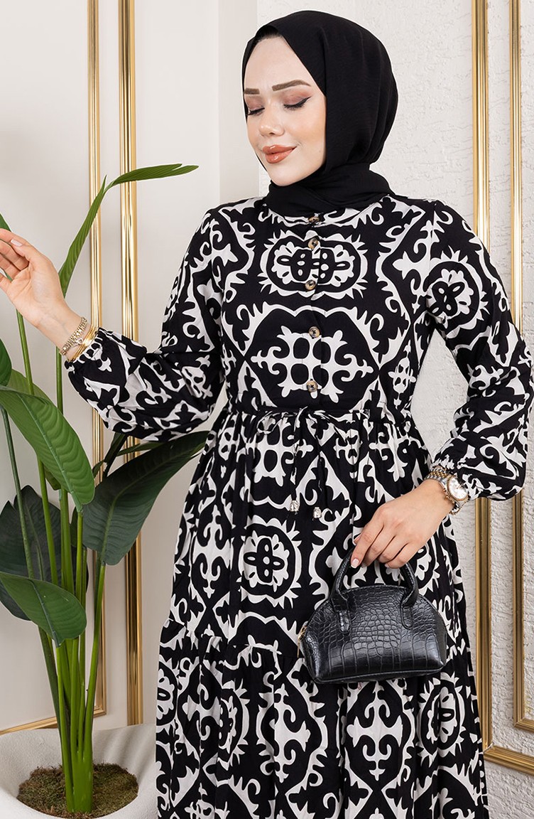 Black color is used. Viscose is a type of synthetic fabric and is convenient to use. Designed with patterned fabric. Buttons have been used to make it easy to use. Tippet collar is prefered. Suitable for 4 seasons. The size worn by the model, is the one on the image.