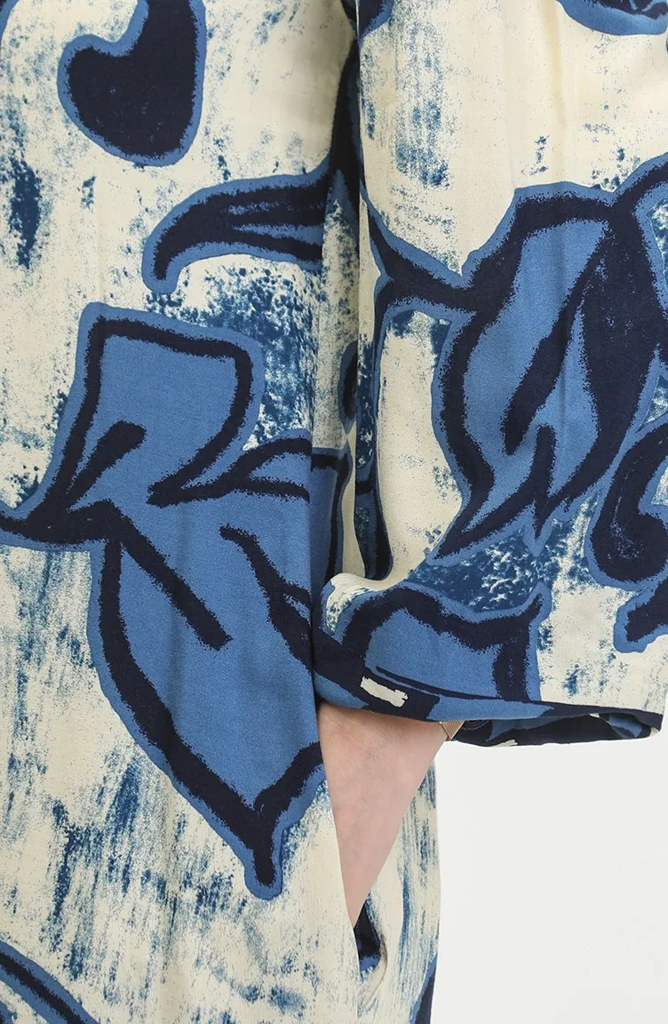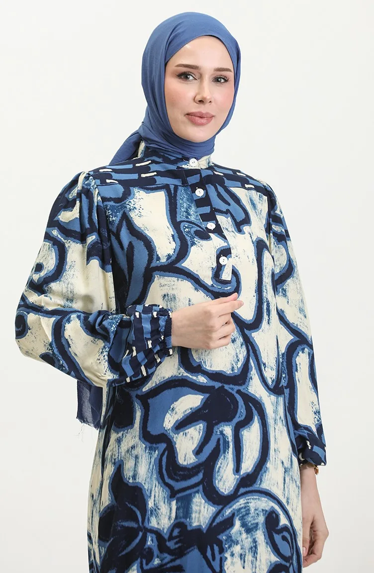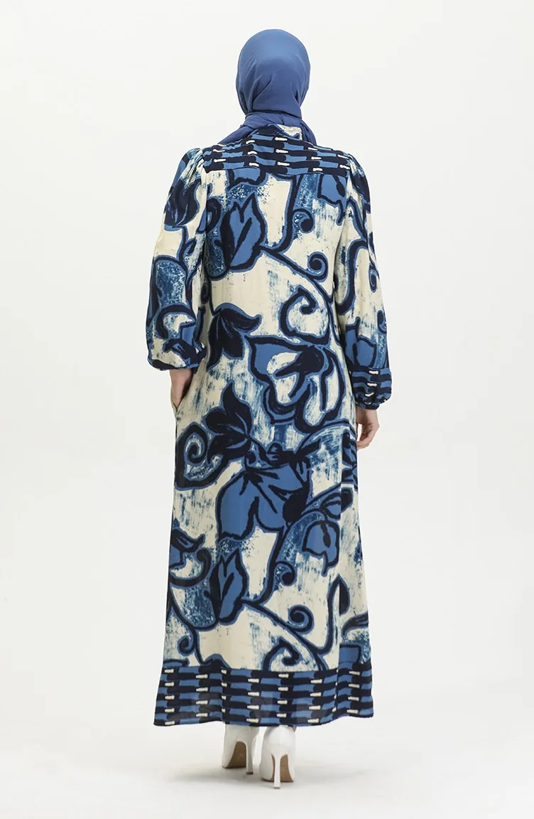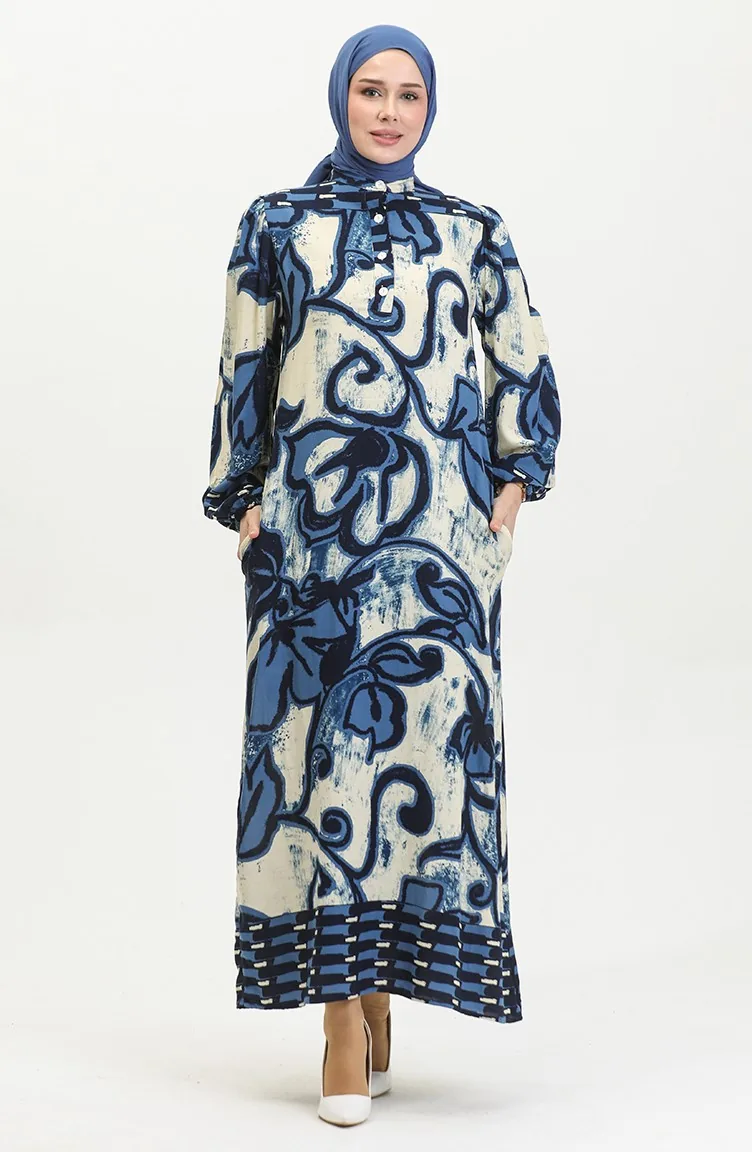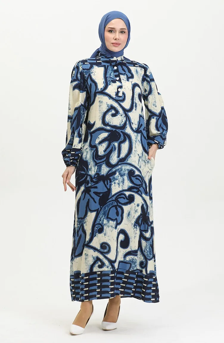 Viscosekleurige Jurk Met Halve Knopen 0396-05 Indigo Beige 0396-05