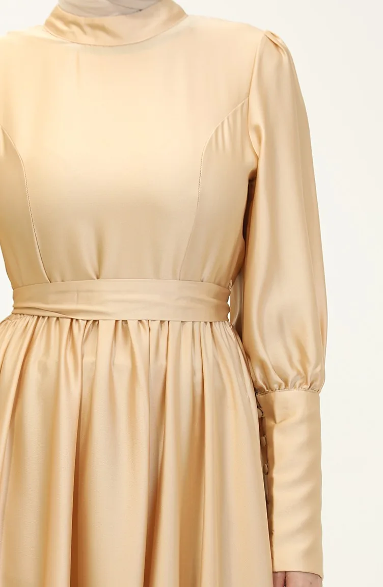 The satin fabric has an elegant texture, pleasant and precise in terms of appearance compared to other types. It has a plain appearance. The product is used unlined. Long sleeve product. Tippet collar is prefered. Plus size option available.