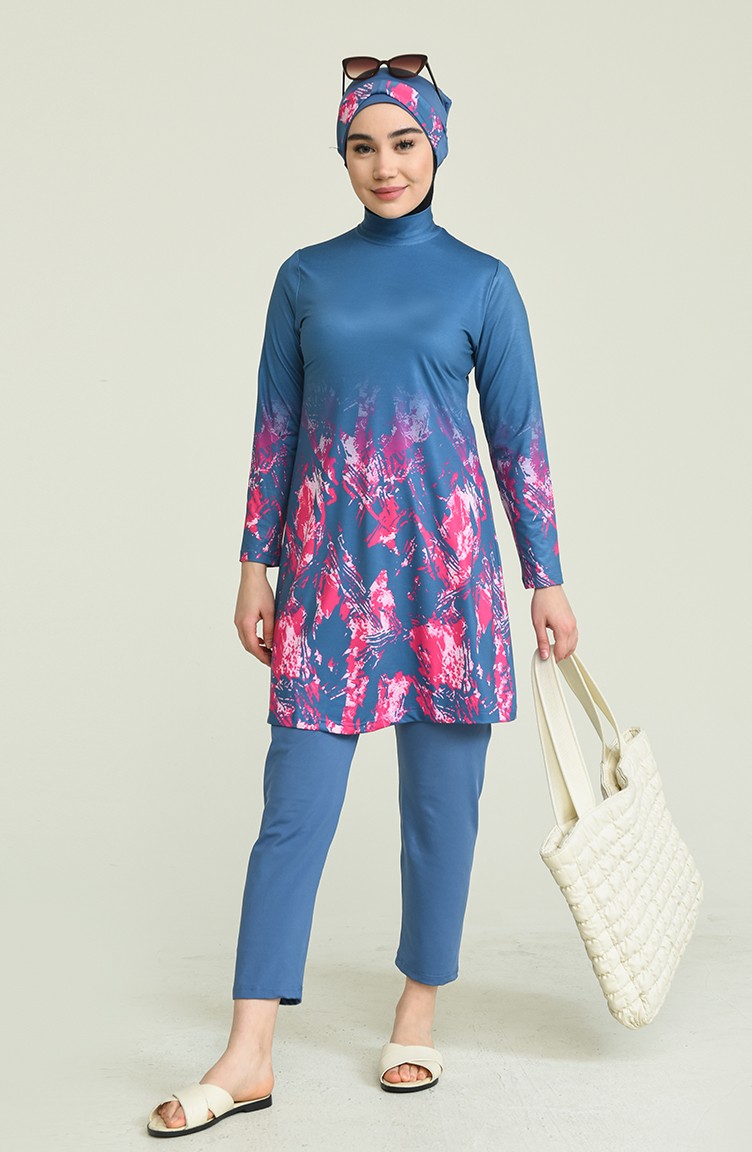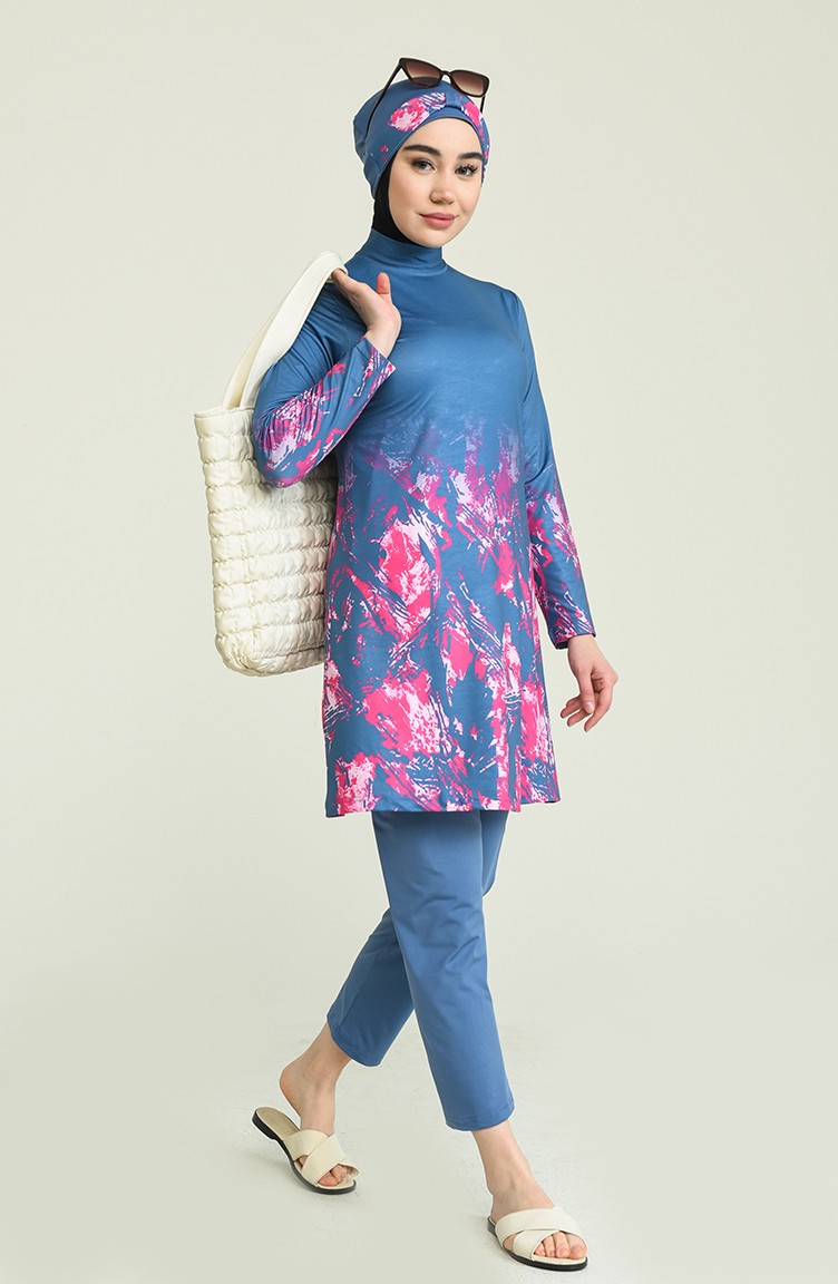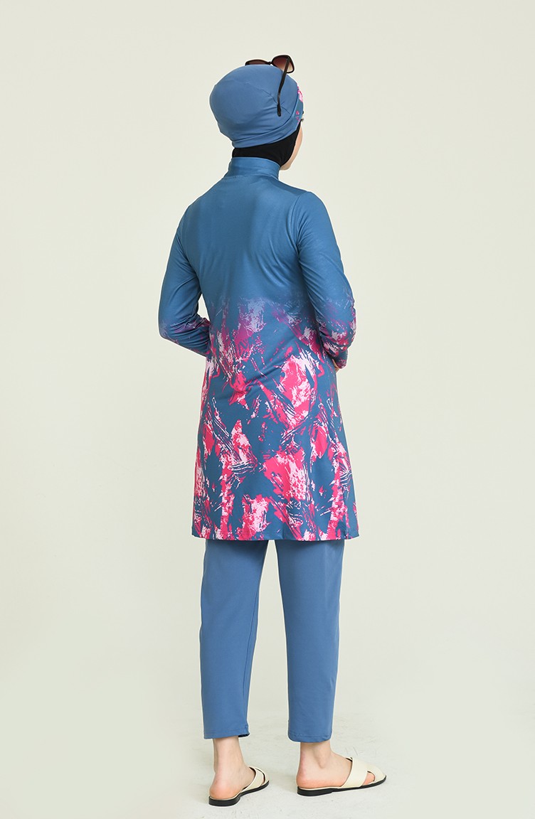 Indigo color is used. Polyester fabric often prevents wrinkling. Designed with patterned fabric. The product is used unlined. Long sleeve product. Dik Yaka. Suitable for 4 seasons. The size worn by the model, is the one on the image.
