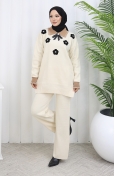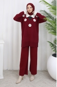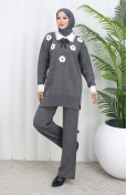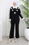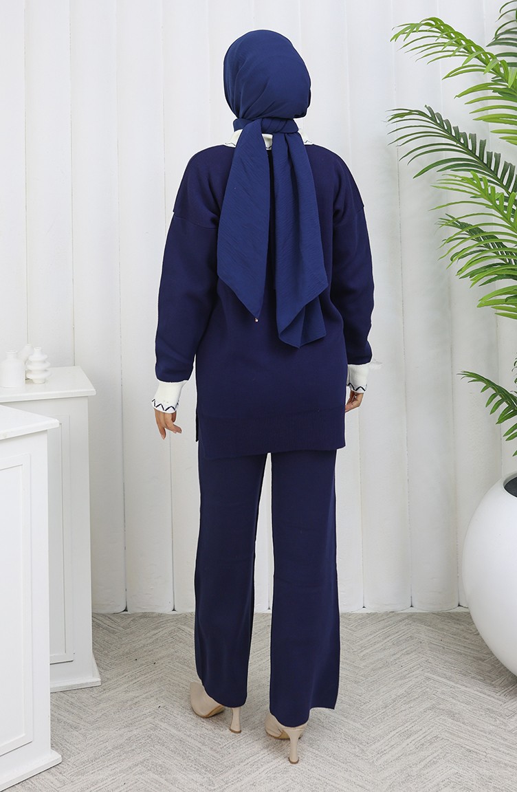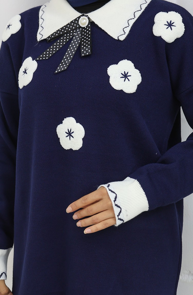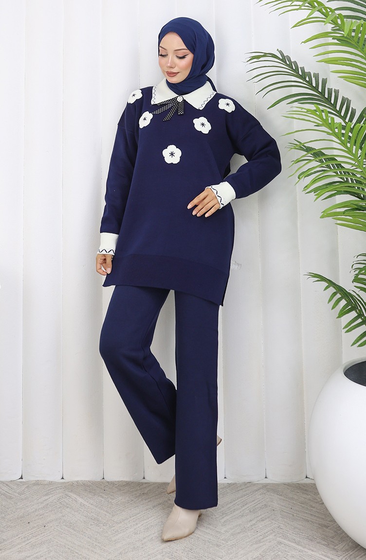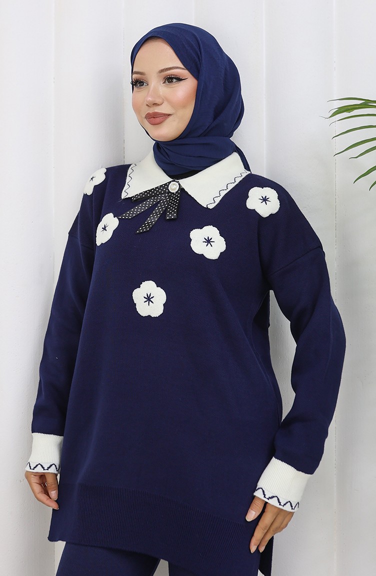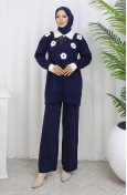 Gebreid Bloemen Tuniek Broek Tweedelig Pak 1113-02 Marineblauw 1113-02