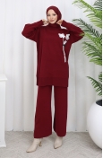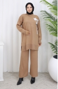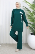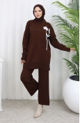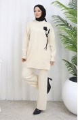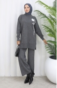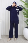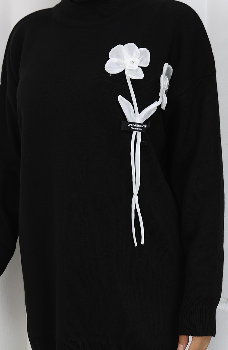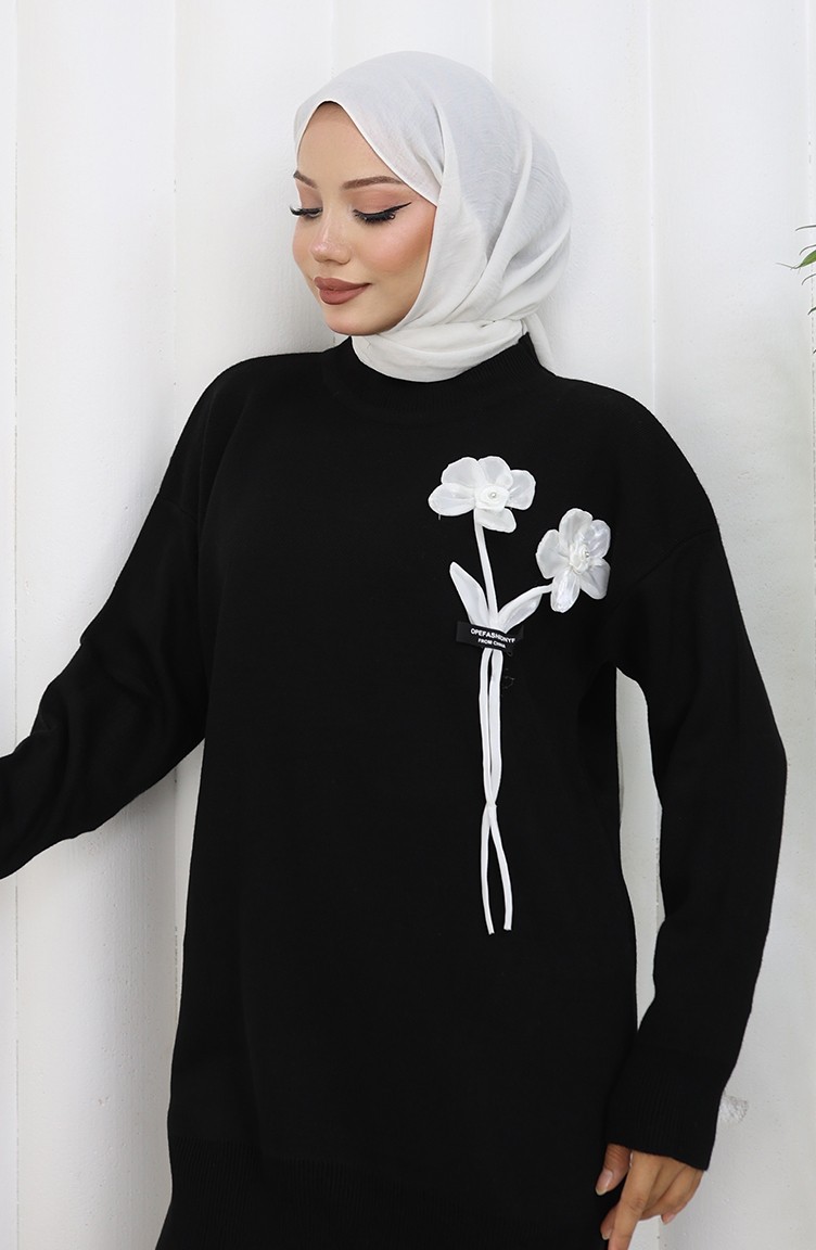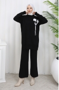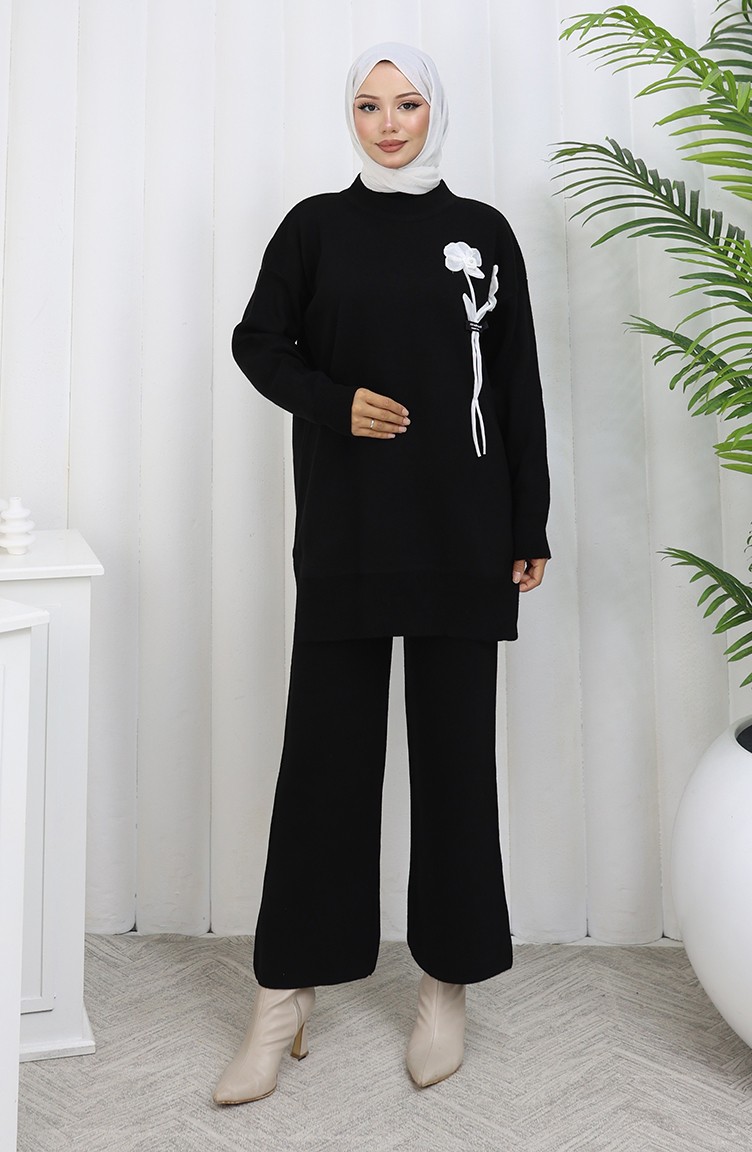 Gebreid Bloemenpatroon Tuniek Broek Tweedelig Pak 1037-06 Zwart 1037-06