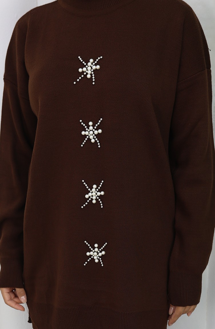 Gebreid Parelmoer Geborduurd Tuniek Broek Tweedelig Pak 1068-07 Bruin 1068-07
