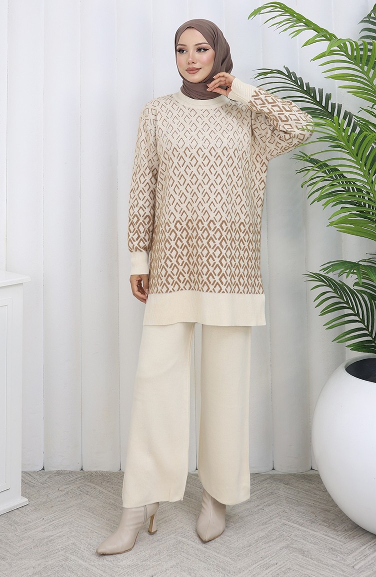 Gebreid Patroon Tuniek Broek Tweedelig Pak 1085-05 Beige 1085-05