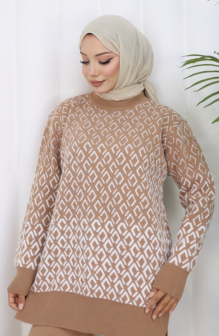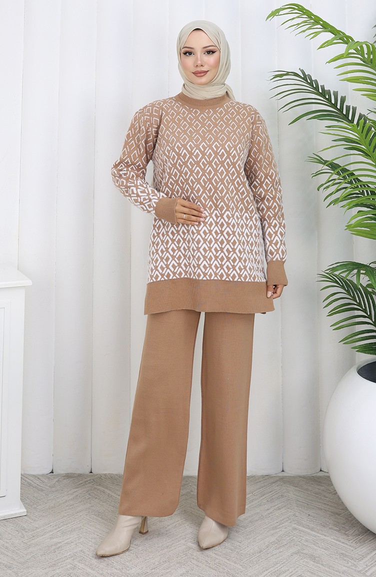 Gebreid Patroon Tuniek Broek Tweedelig Pak 1085-07 Melk Koffie 1085-07