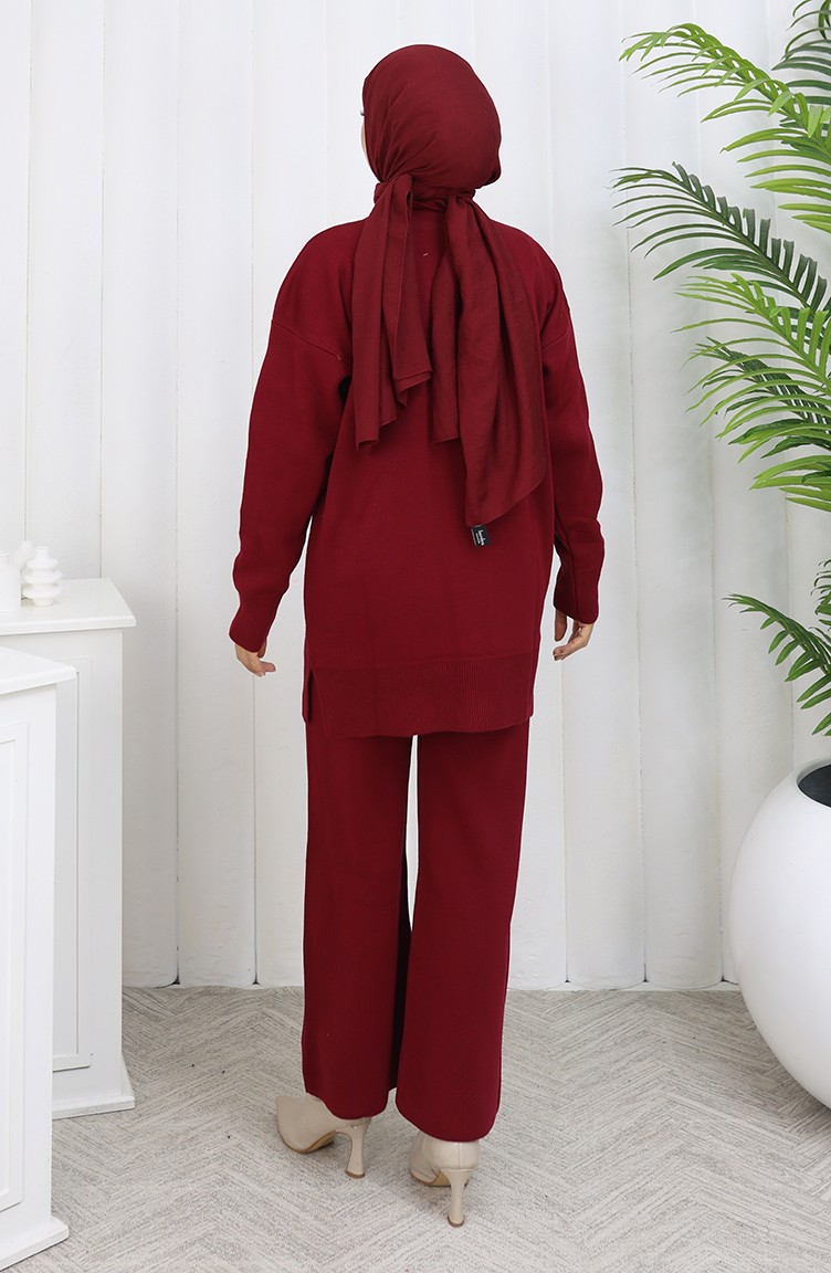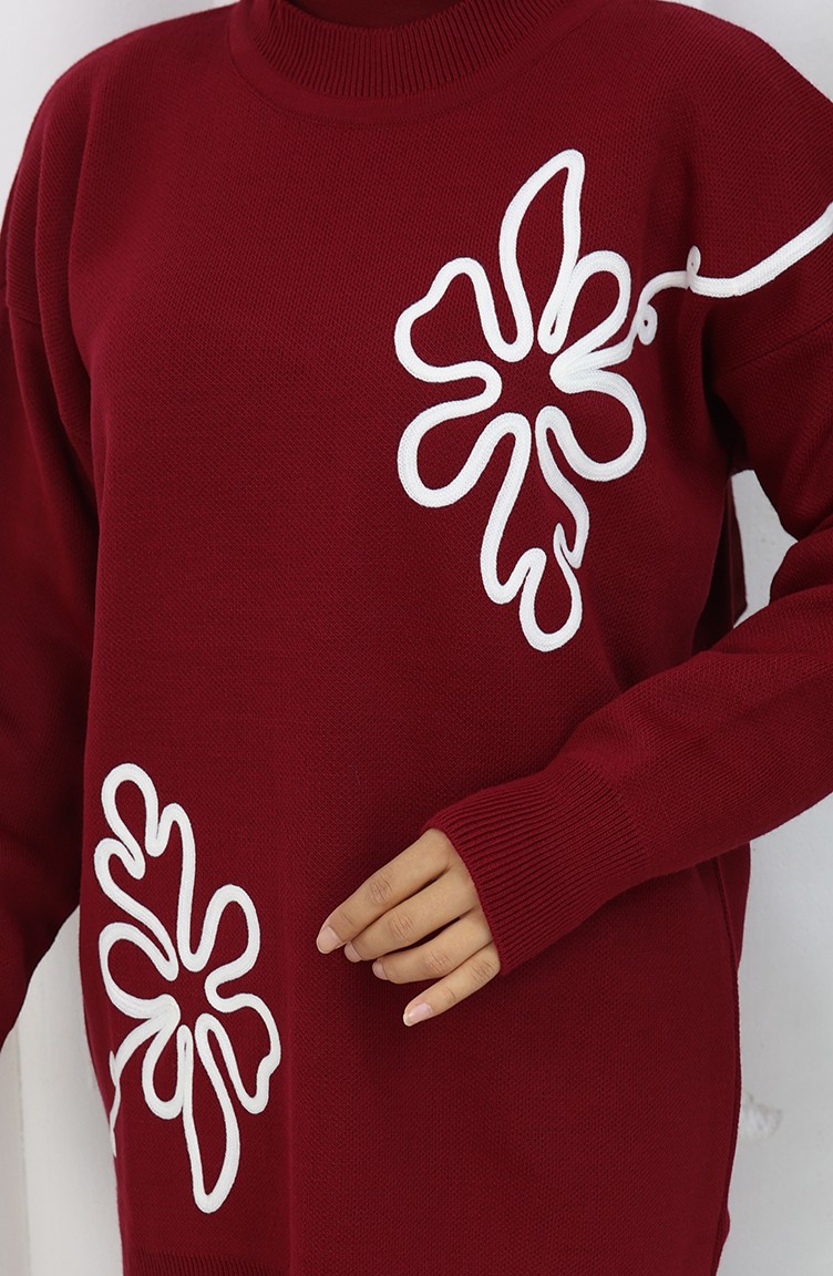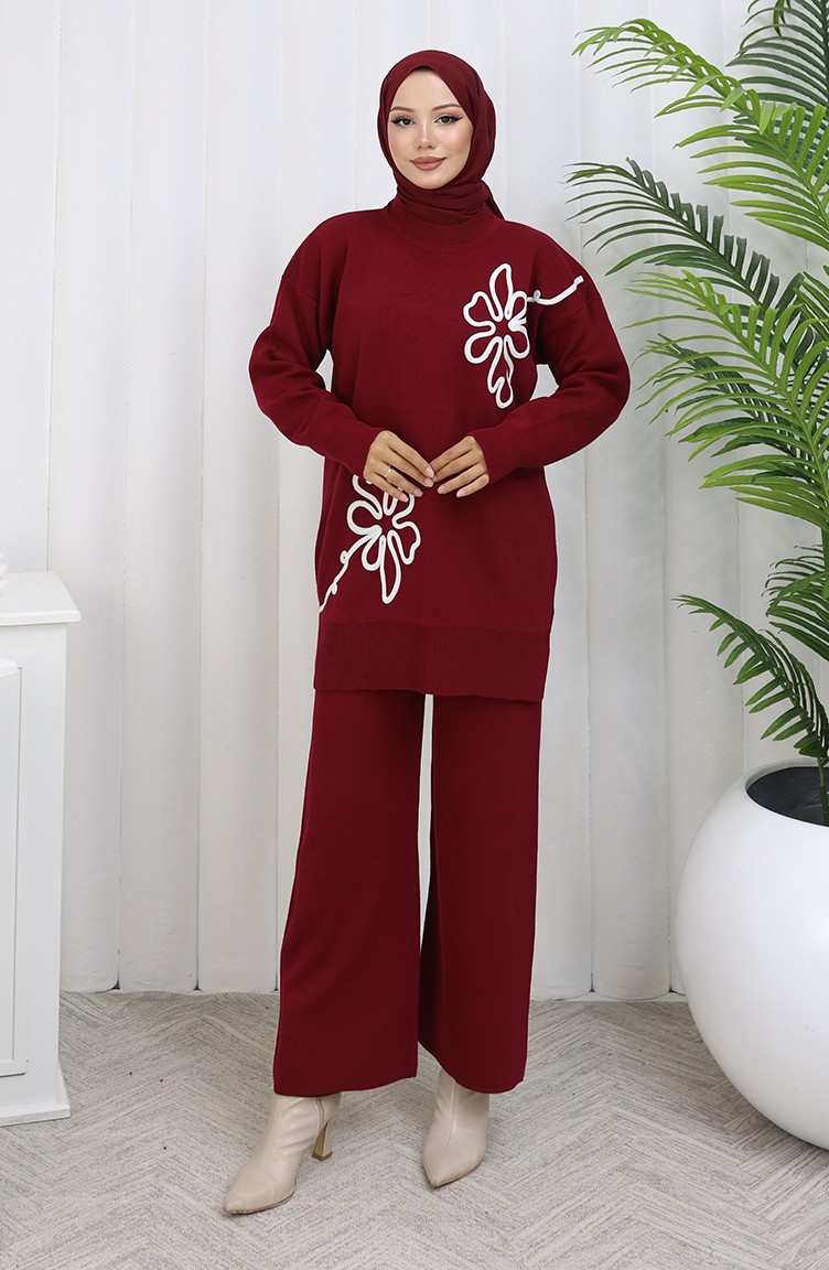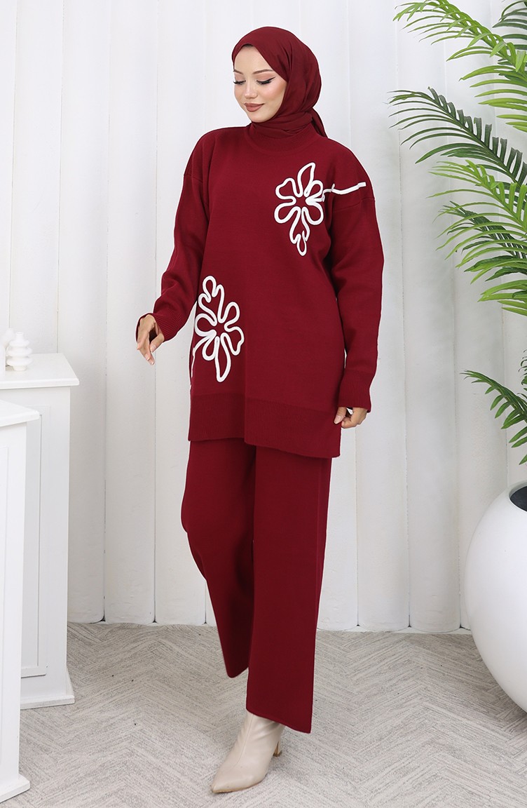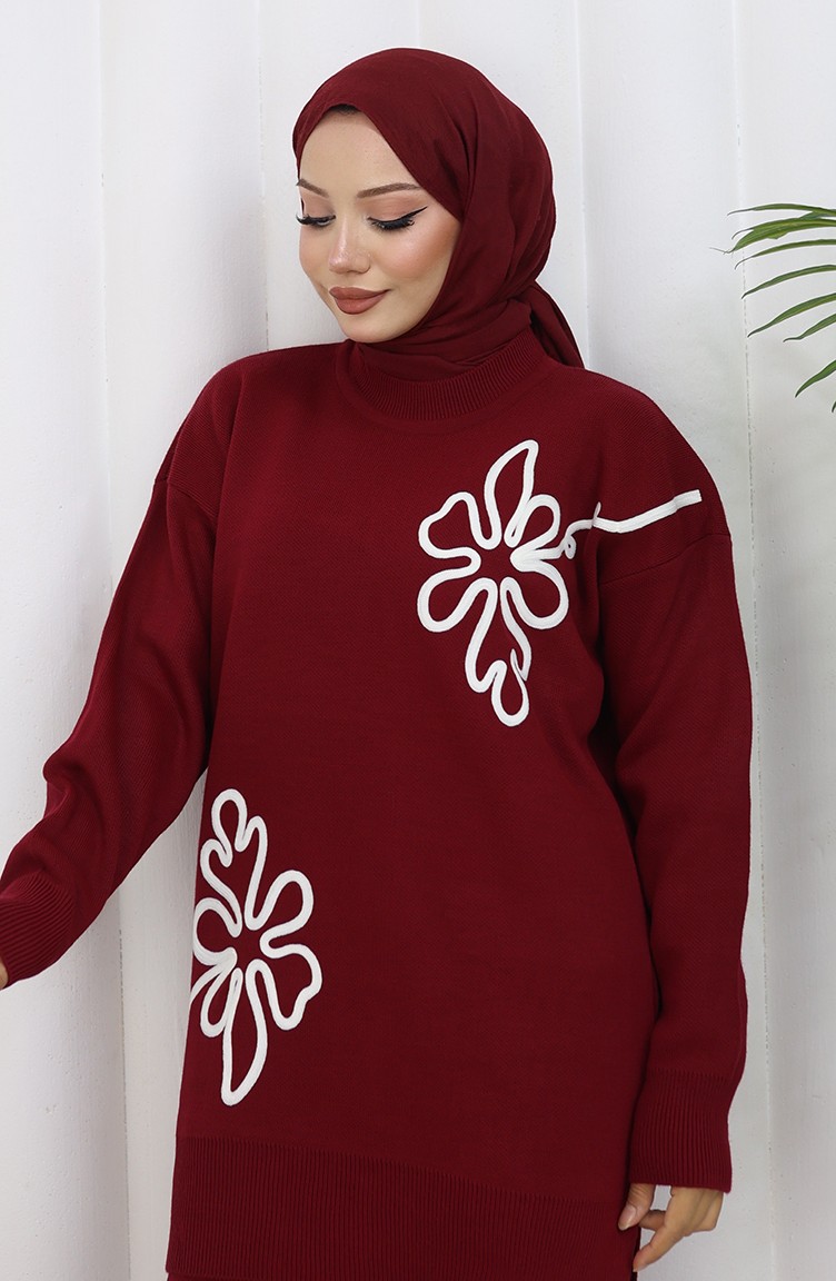 Gebreid Tuniek Met Bloemenmotief Tweedelig Pak 1110-02 Bordeauxrood 1110-02