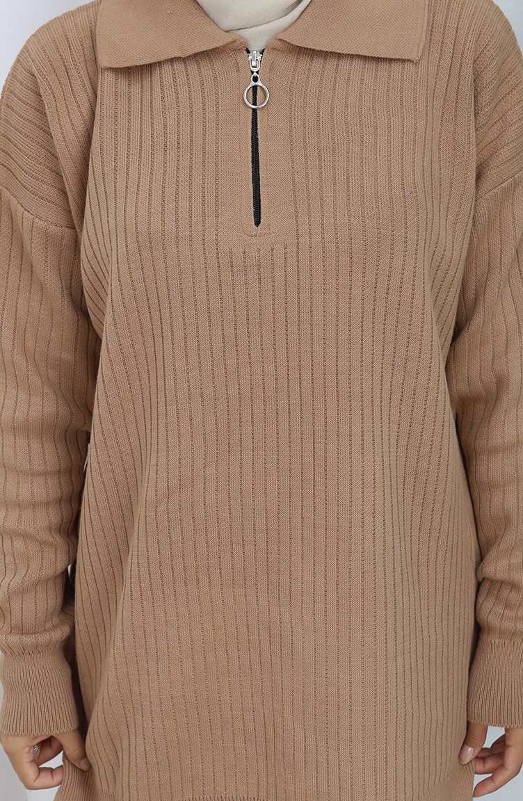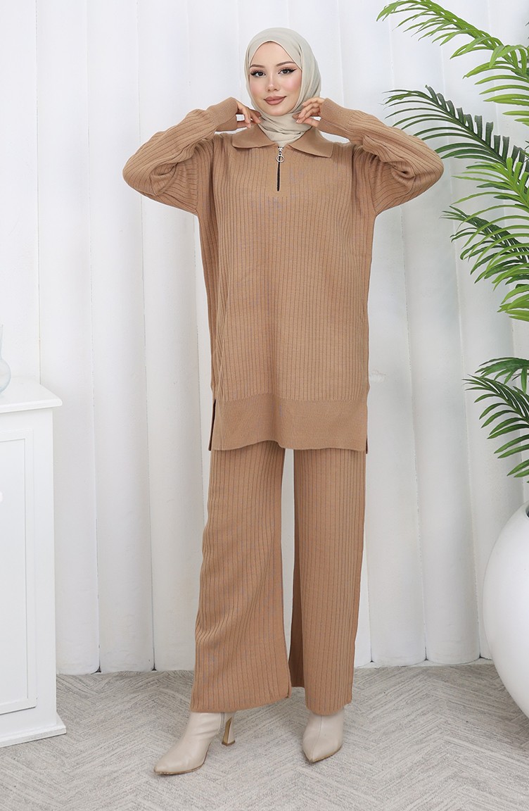 Gebreid Tuniek Met Rits En Strepen Tweedelig Pak 1073-04 Melkkoffie 1073-04