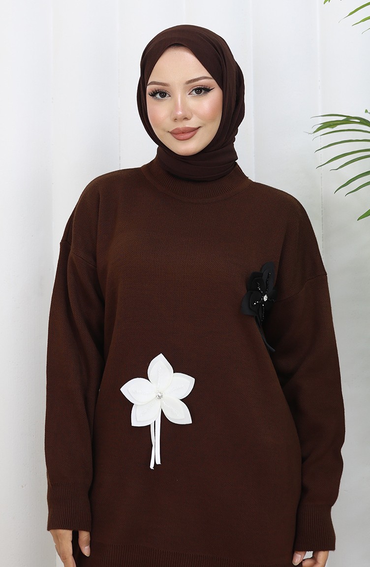 Gebreide Bloemen Tuniek Broek Tweedelig Set 1077-03 Bruin 1077-03