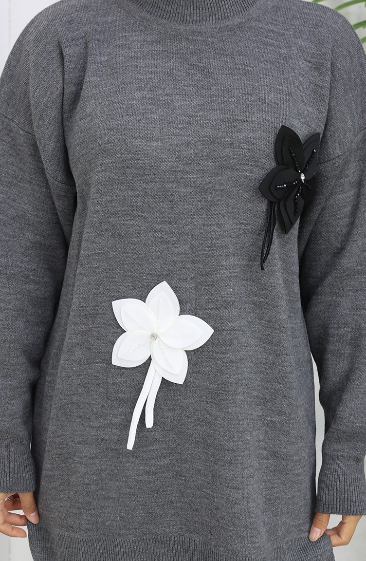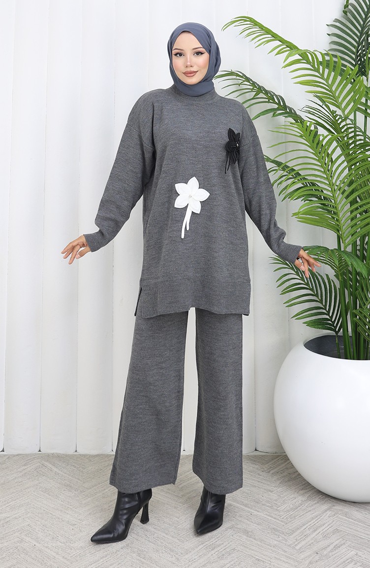 Gebreide Bloemen Tuniek Broek Tweedelig Set 1077-04 Grijs 1077-04