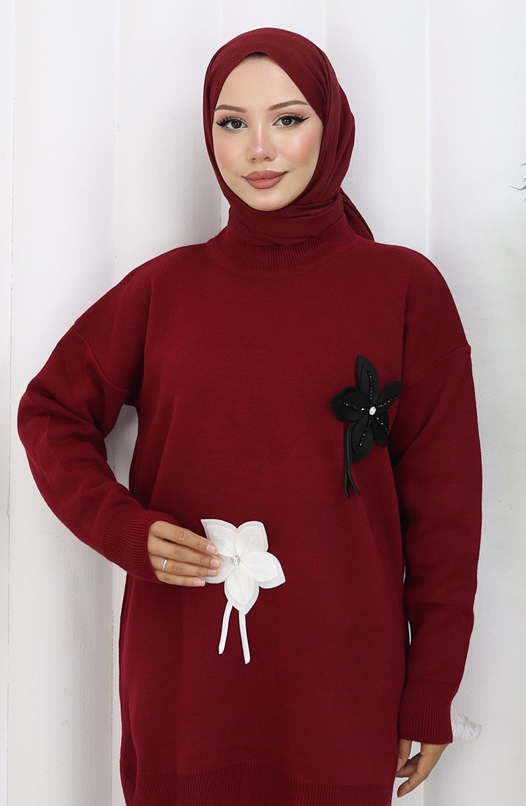 Gebreide Bloemen Tuniek Broek Tweedelig Set 1077-06 Bordeauxrood 1077-06