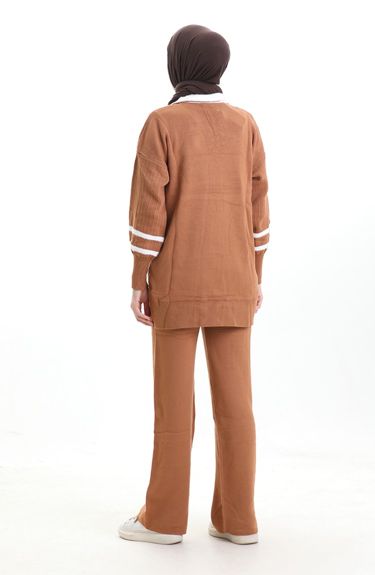 Gebreide Kraag Gedetailleerde Tuniek Broek Tweedelig Set 1002-11 Bruin 1002-11