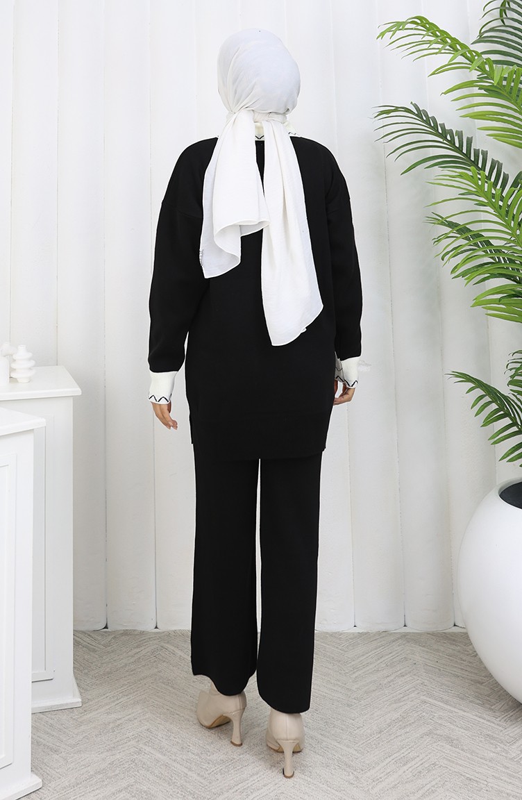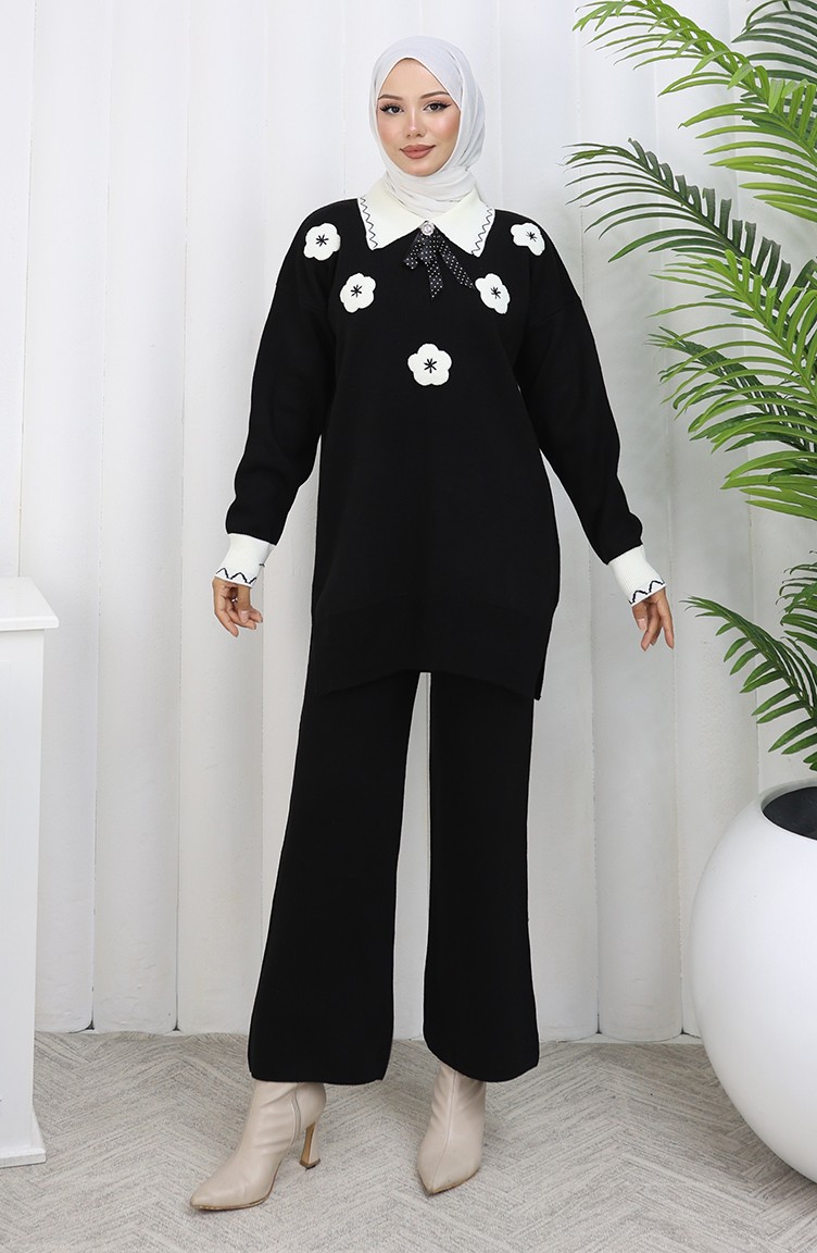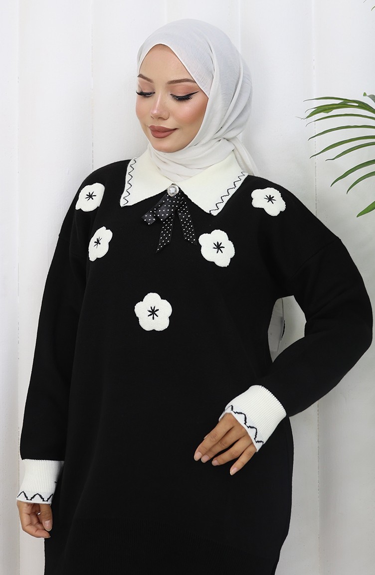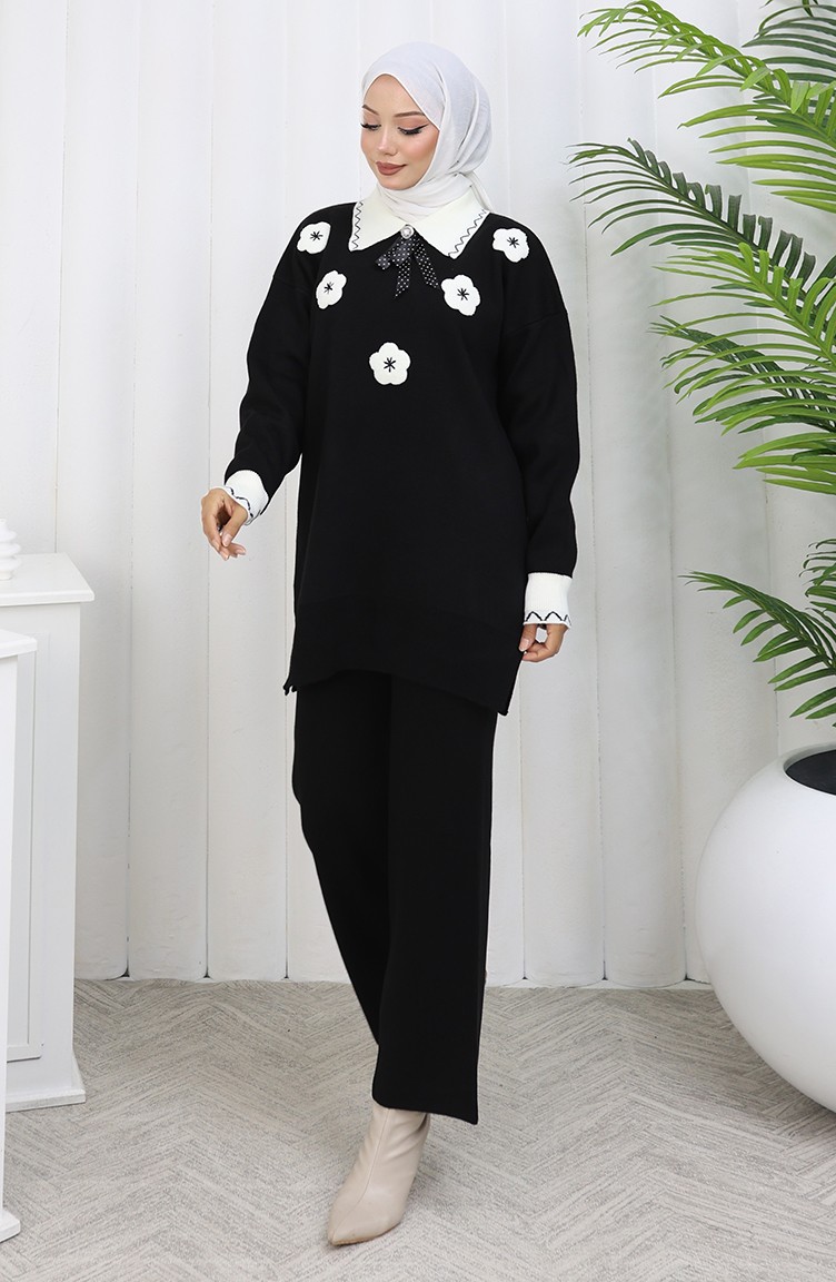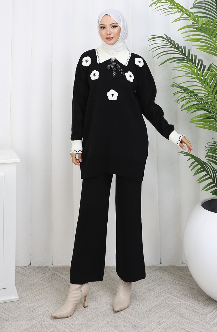 Gebreide Tuniek Met Bloemenapplicatie Tweedelige Set 1113-04 Zwart 1113-04