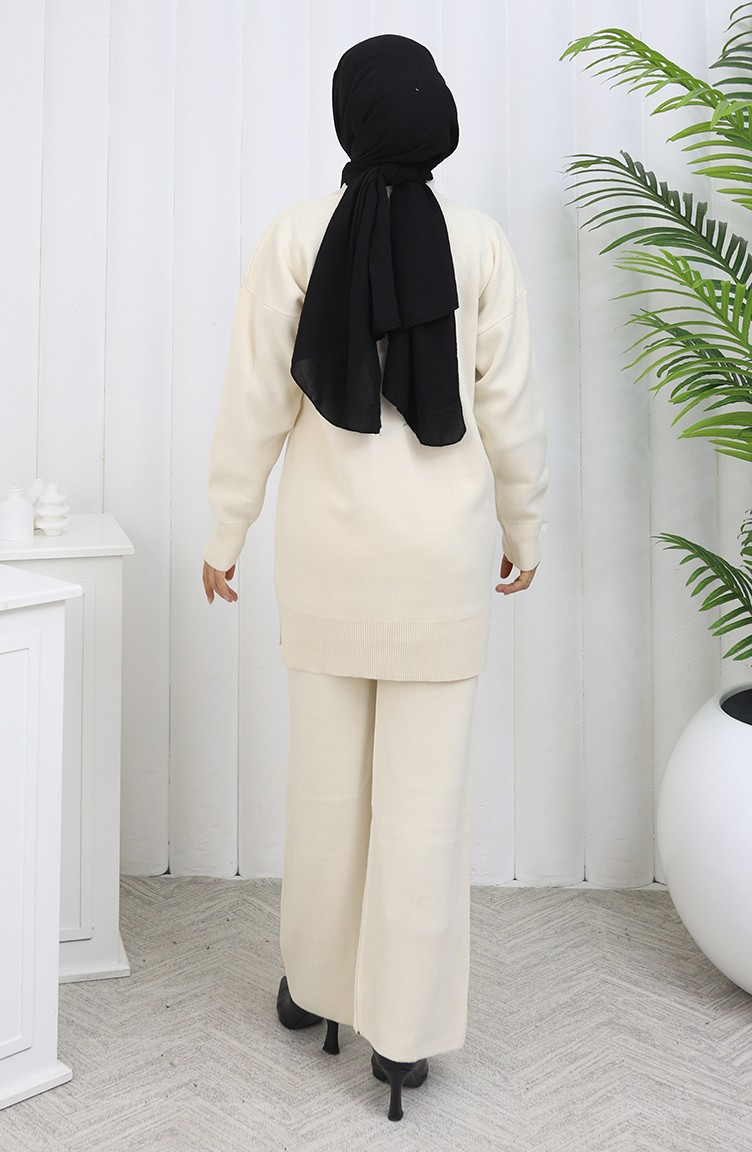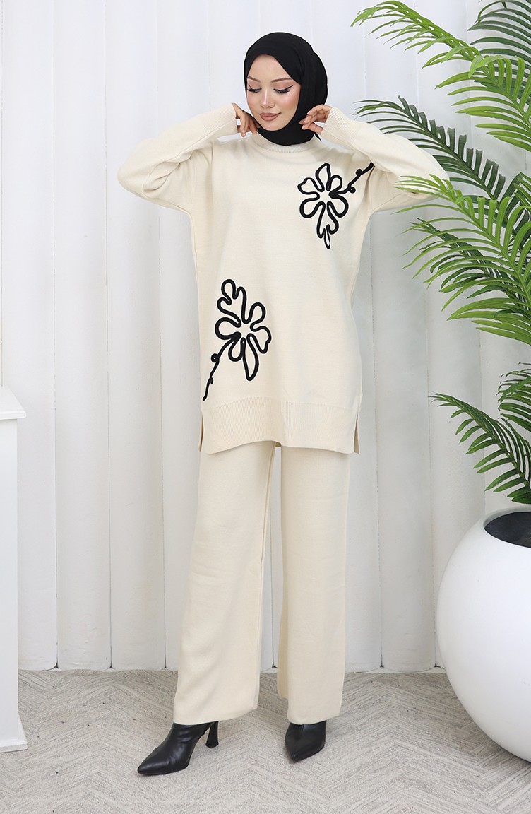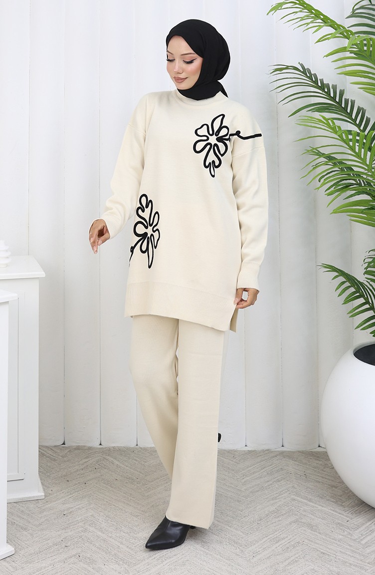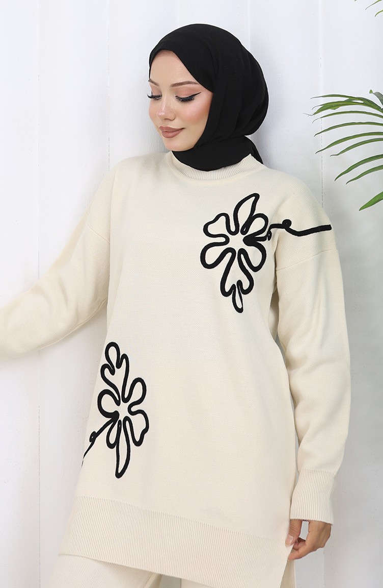 Gebreide Tuniek Met Bloemenmotief Tweedelig Setje 1110-08 Beige 1110-08