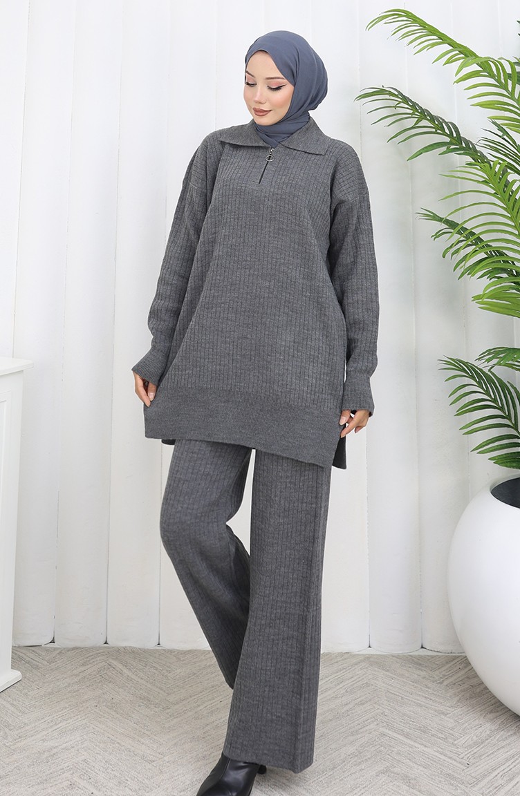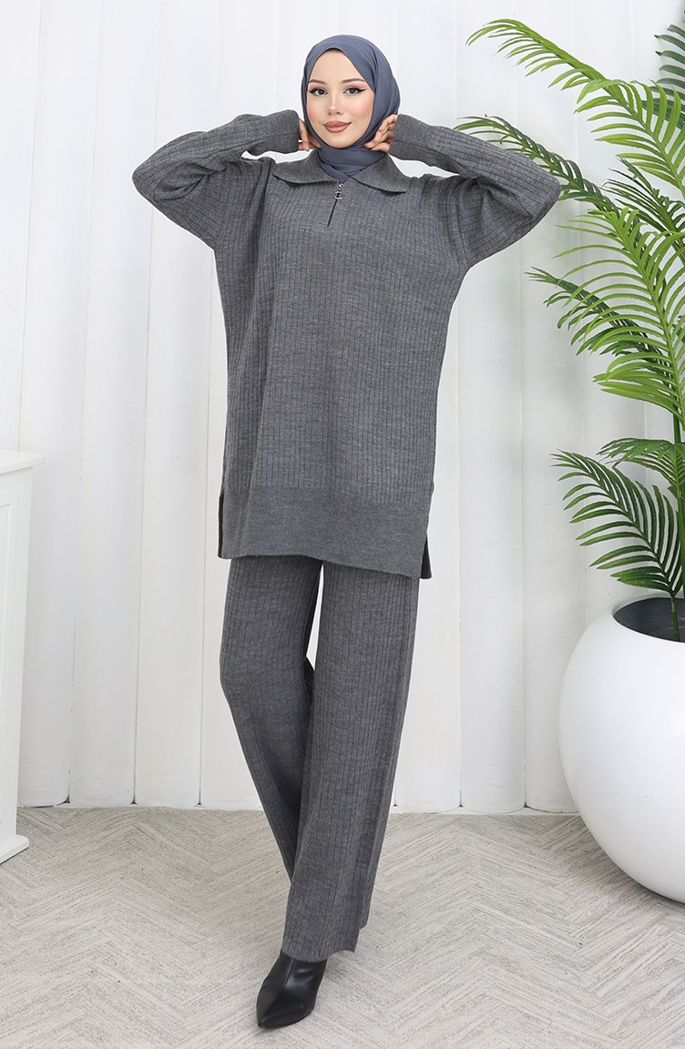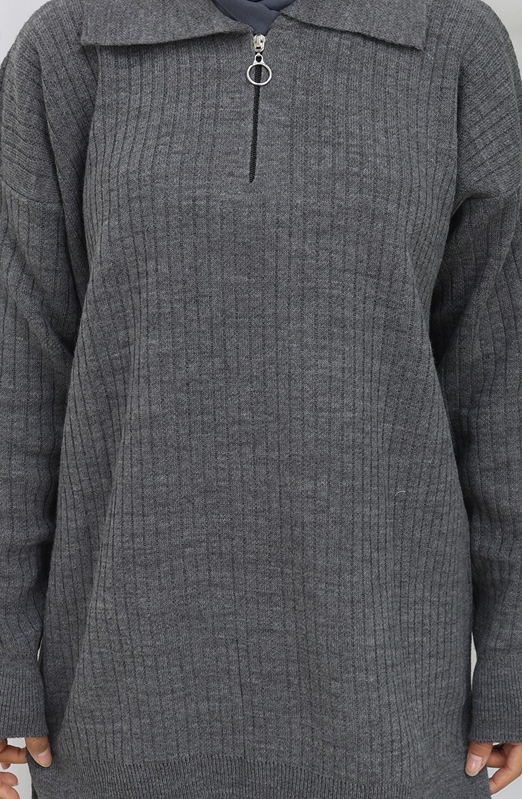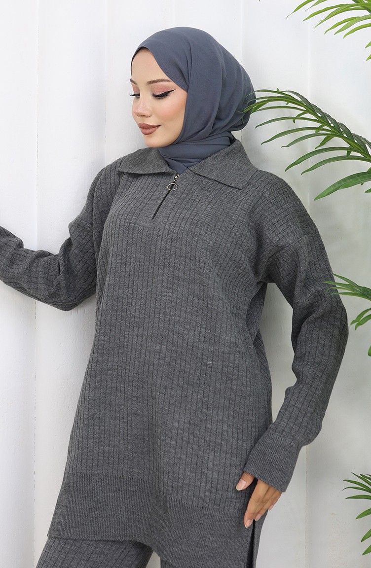 Gebreide Tuniek Met Rits En Strepen Tweedelig Pak 1073-08 Grijs 1073-08