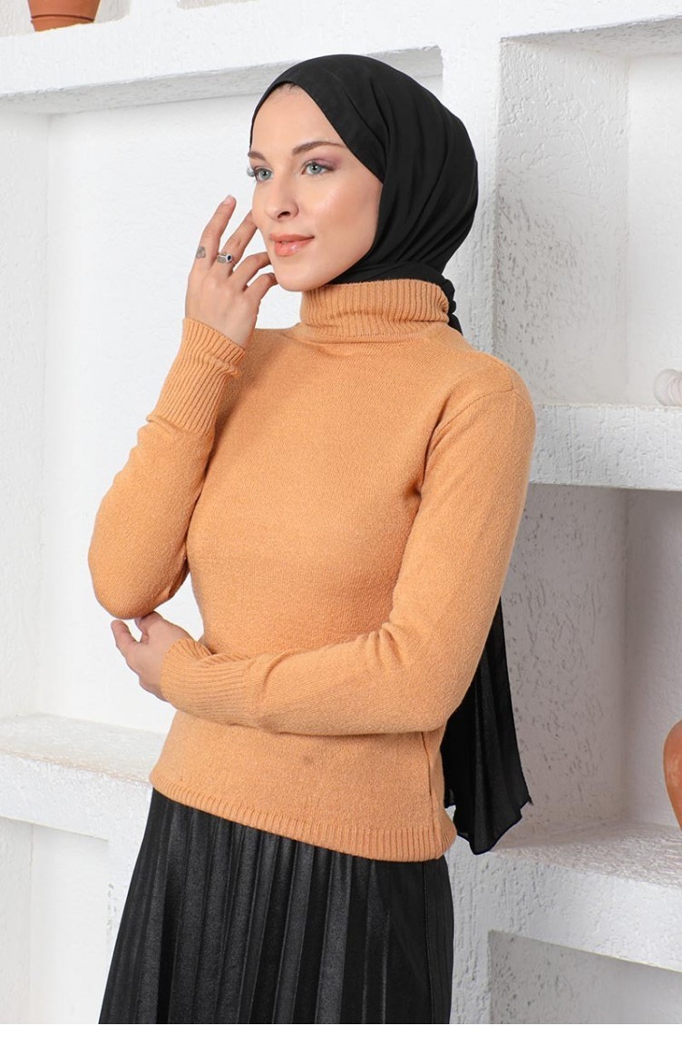 The camel color is used. Knitwear is an indispensable type of fabric for the winter months. It has a plain appearance. Designed from thick fabric.