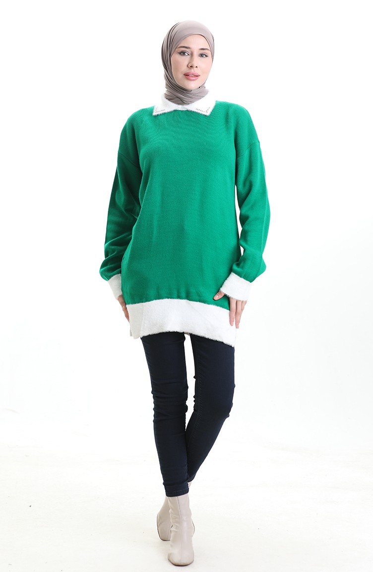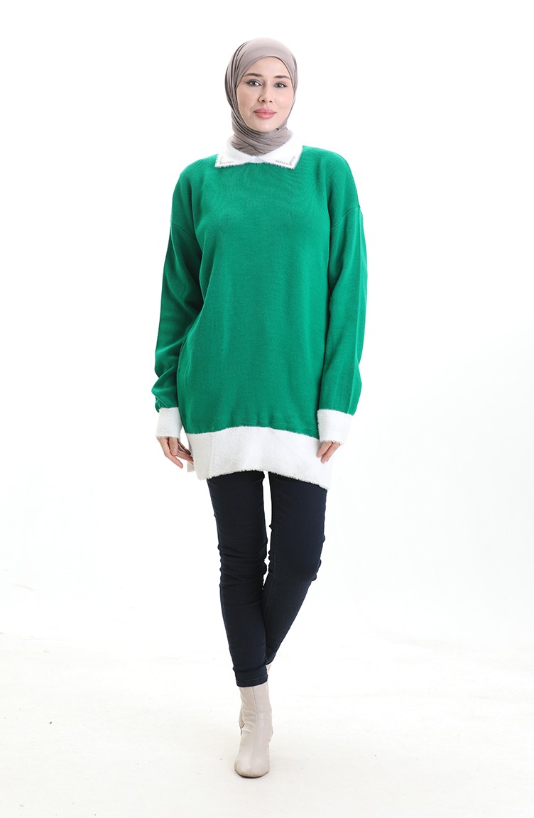 Emerald green color used. Designed by Acrylic fabric. It has a plain appearance. When the tunic combined with another product, you will get a nice suit. Designed from thick fabric. The size worn by the model, is the one on the image.