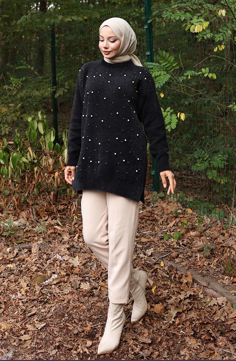 Black color is used. Knitwear is an indispensable type of fabric for the winter months. It has a plain appearance. Our accessories that add to the visual enriching product. Designed from thick fabric. The size worn by the model, is the one on the image.
