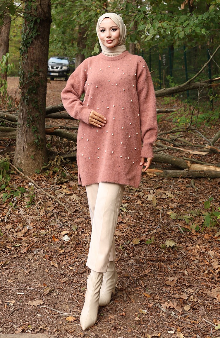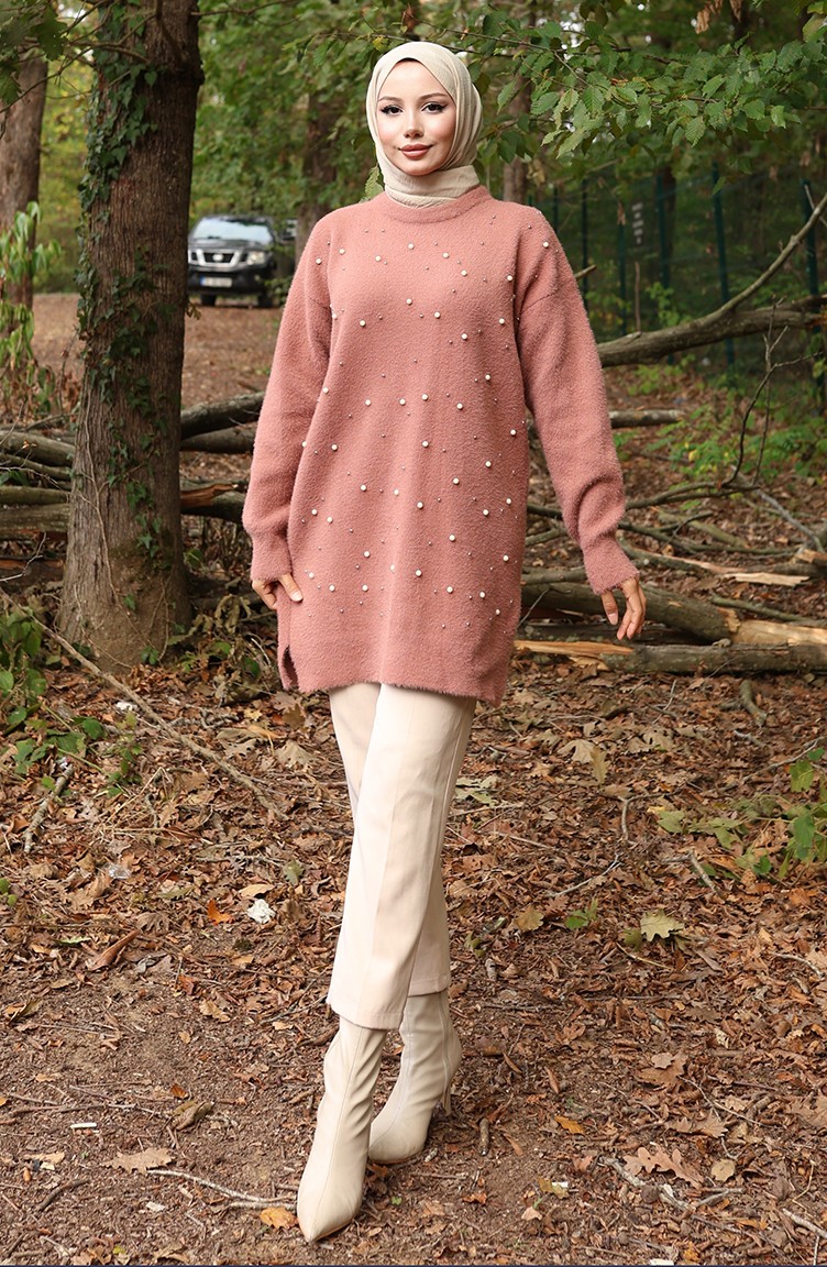 The light pink color is used. Knitwear is an indispensable type of fabric for the winter months. It has a plain appearance. Our accessories that add to the visual enriching product. Designed from thick fabric. The size worn by the model, is the one on the image.