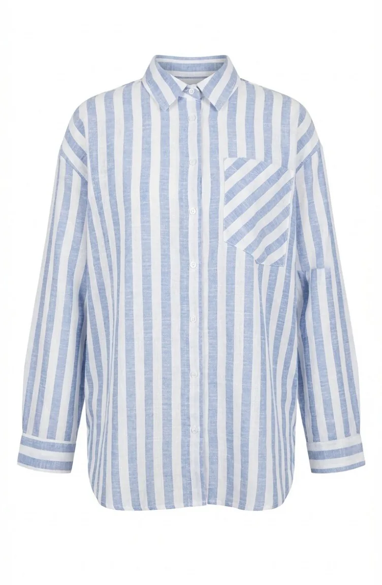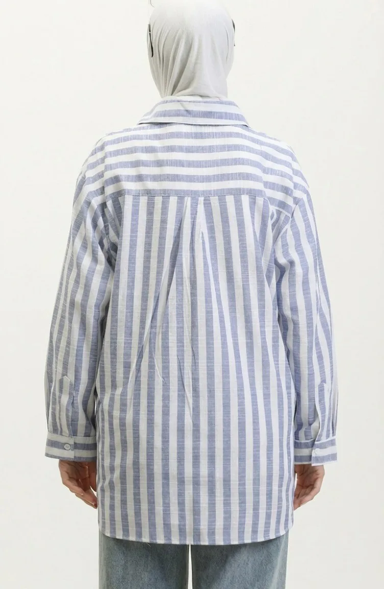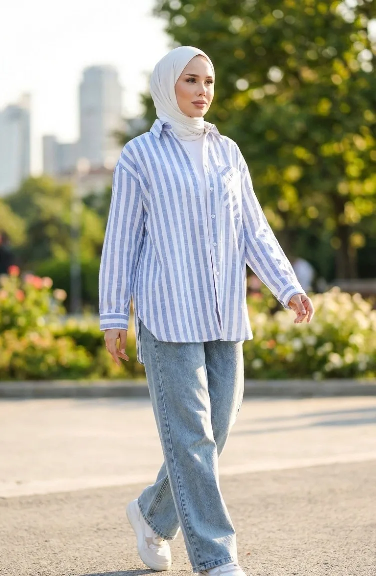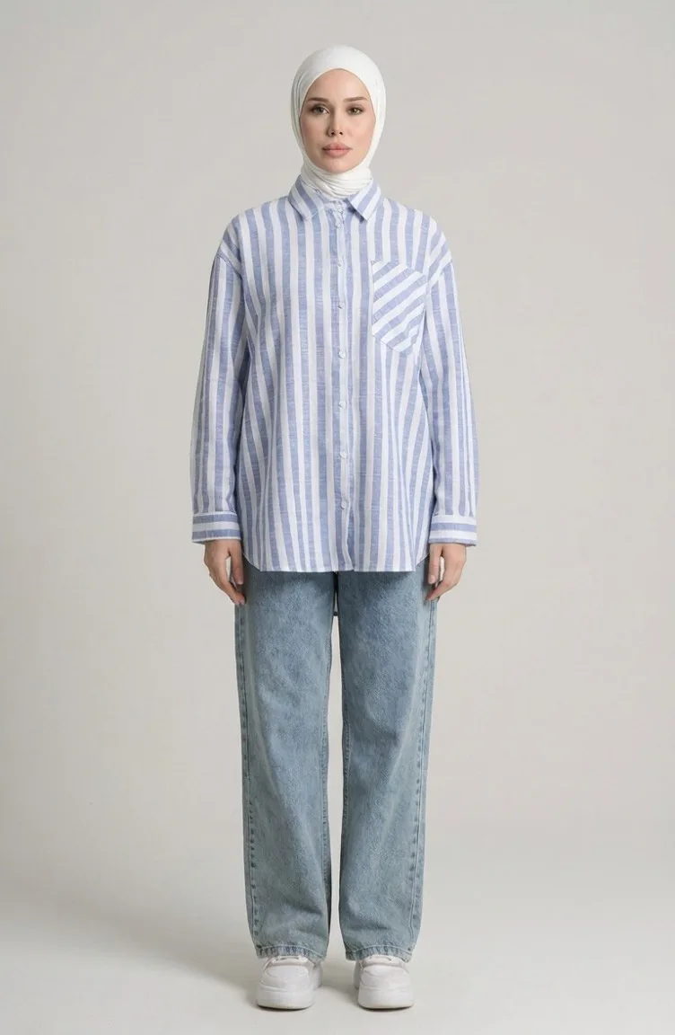 Indigo color is used. The cotton fabric has an absorbent texture. Designed with a striped fabric. The product is used unlined. Long sleeve product. Suitable for 4 seasons. Plus size option available.