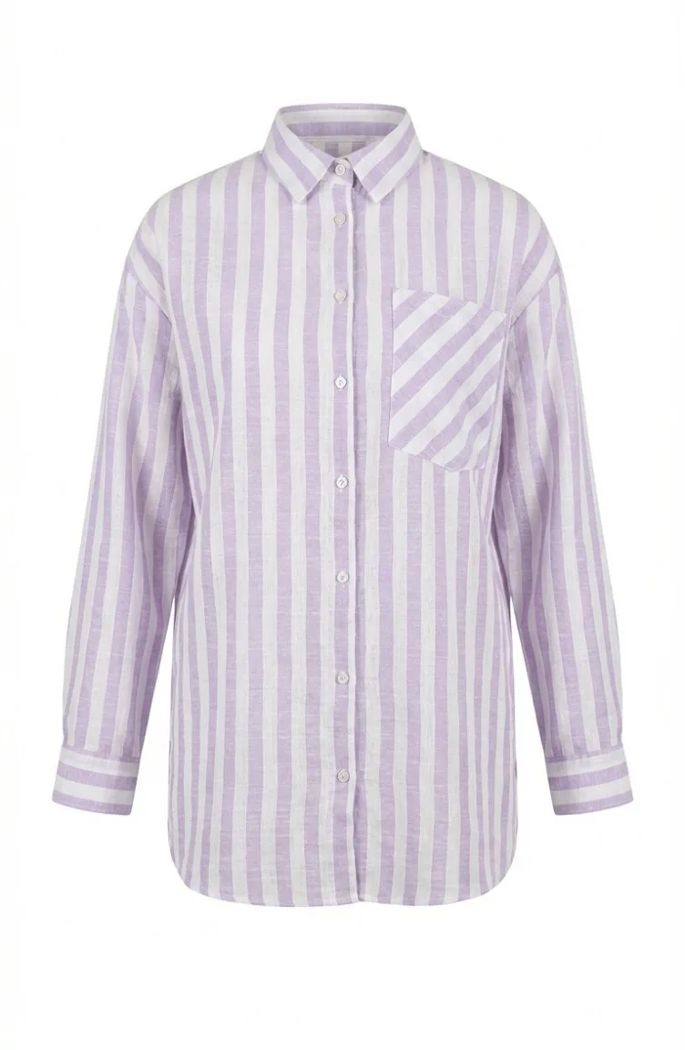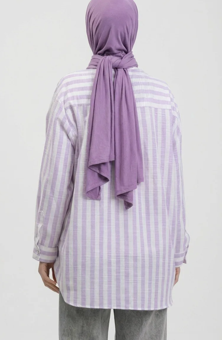 Lilac color is used. The cotton fabric has an absorbent texture. Designed with a striped fabric. The product is used unlined. Long sleeve product. Suitable for 4 seasons. Plus size option available.