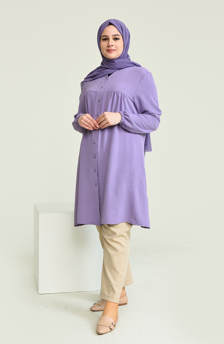 Lilac color is used. Polyester fabric often prevents wrinkling. It has a plain appearance. The product is used unlined. Long sleeve product. The Zero collar is preferred for all types of clothing. Suitable for 4 seasons. Plus size option available.