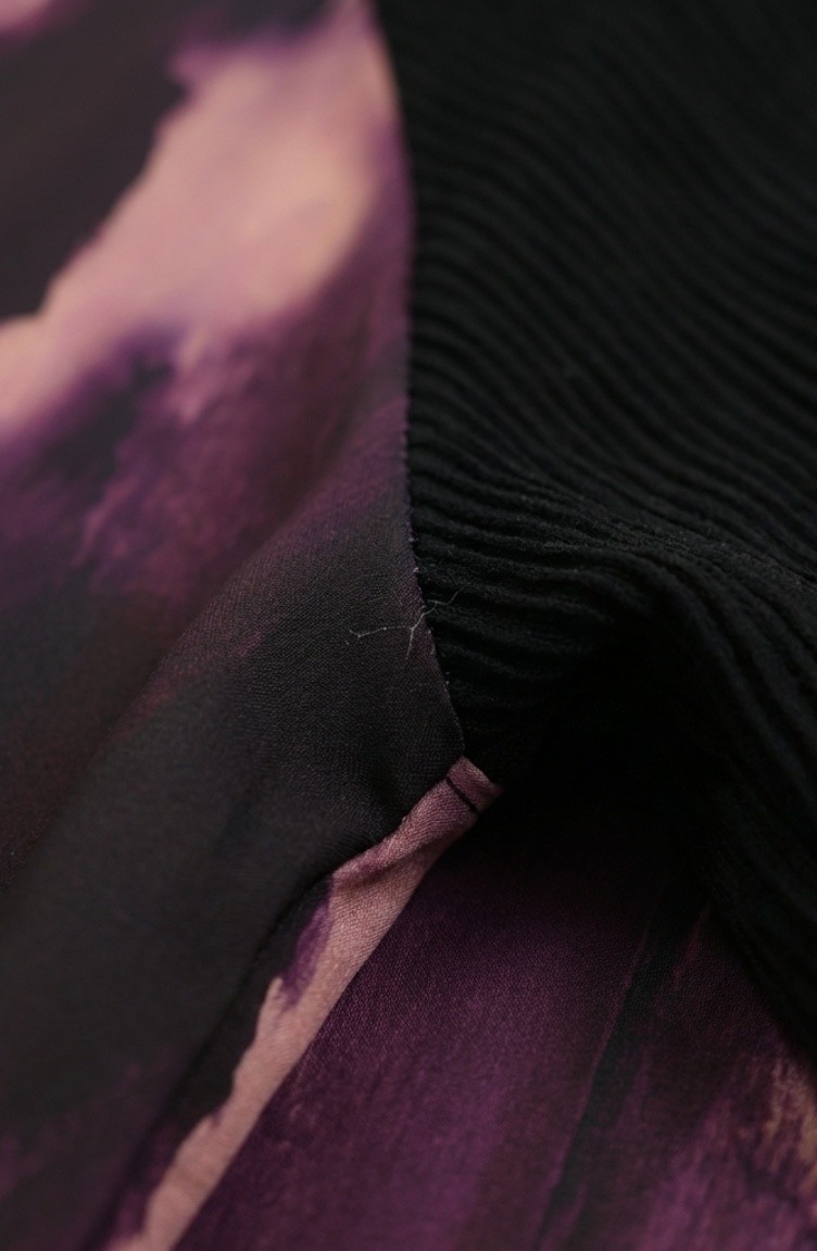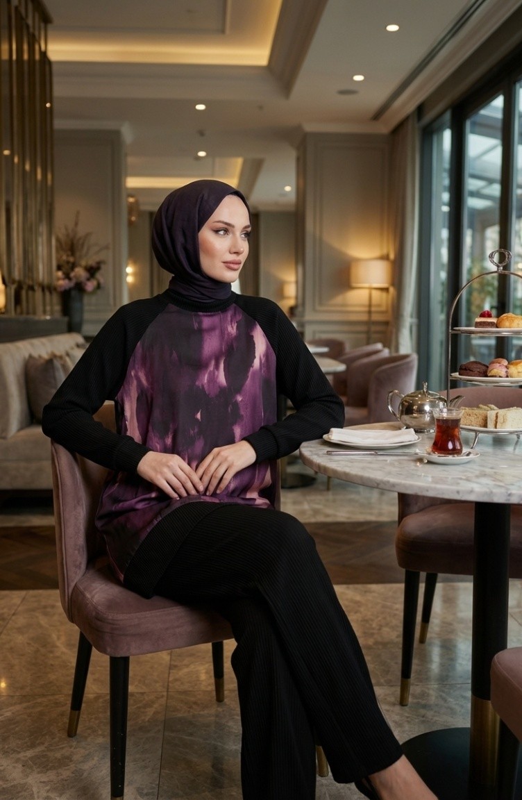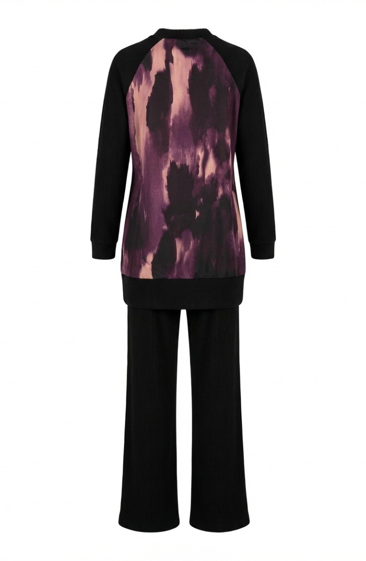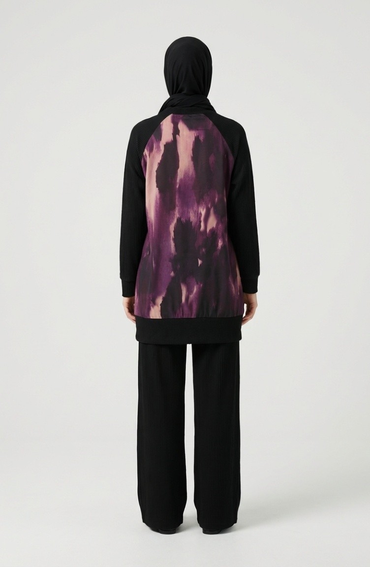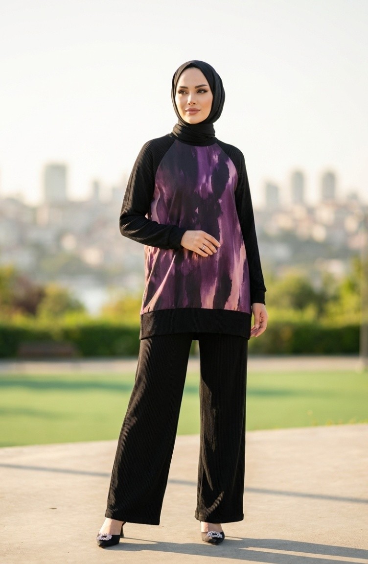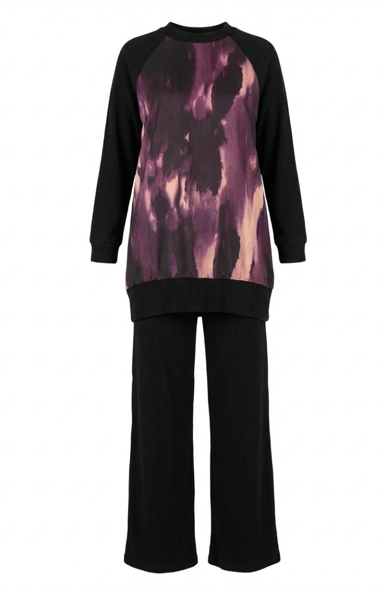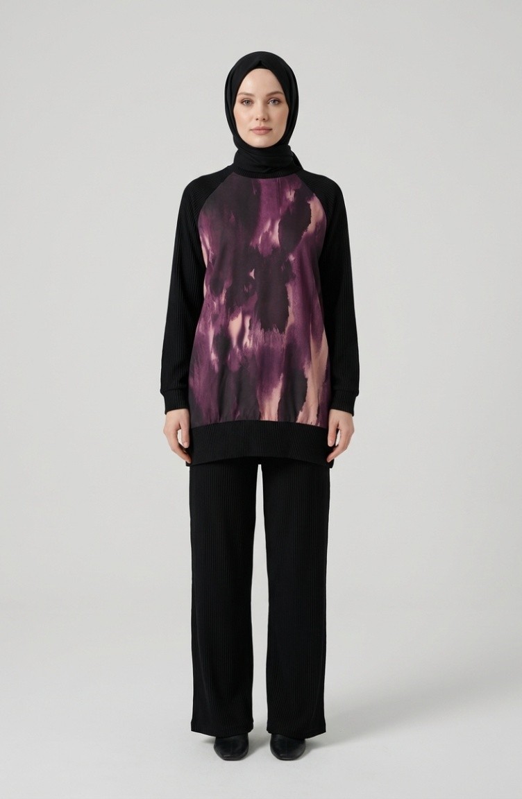 Bedrukte Geplooide Tuniek En Broek Tweedelige Set 2215-01 Zwart Paars 2215-01