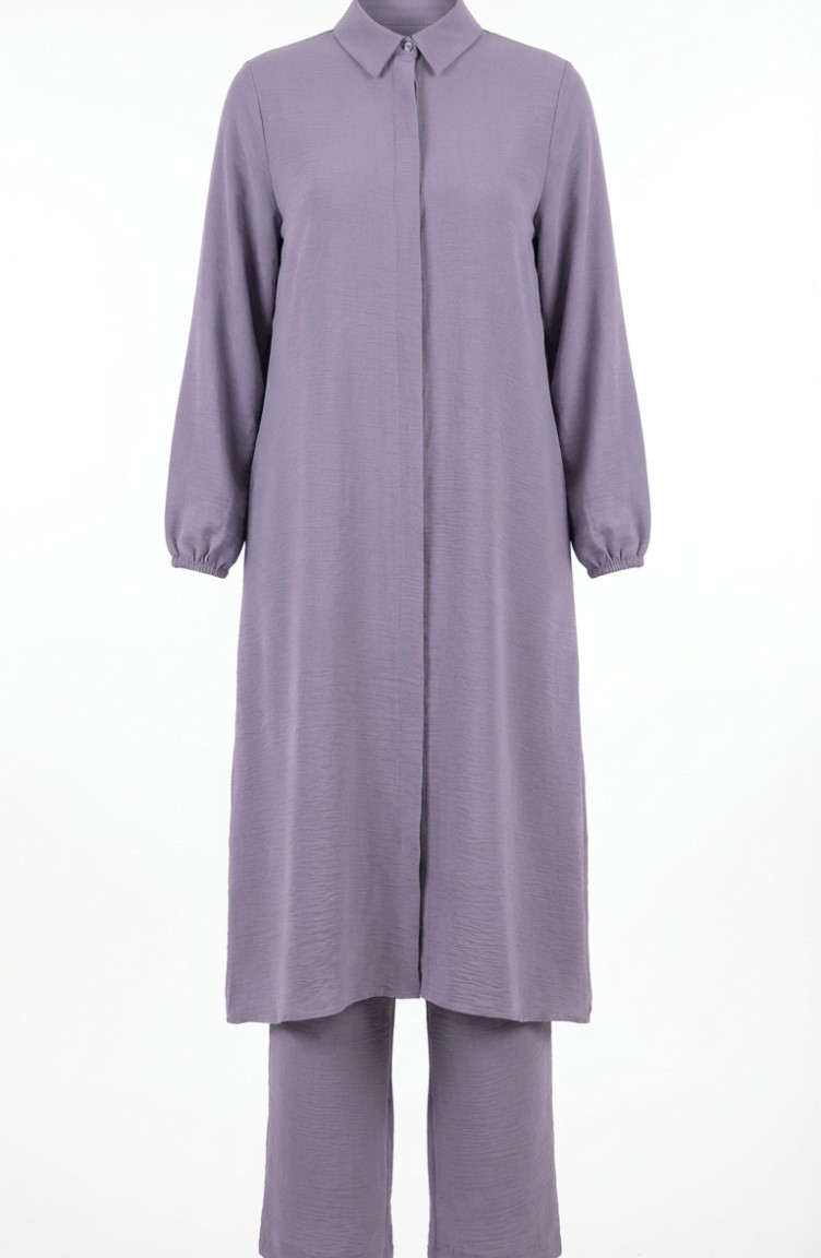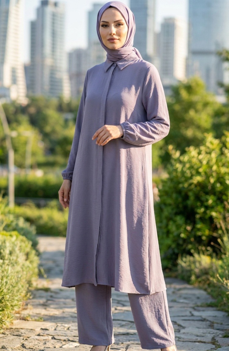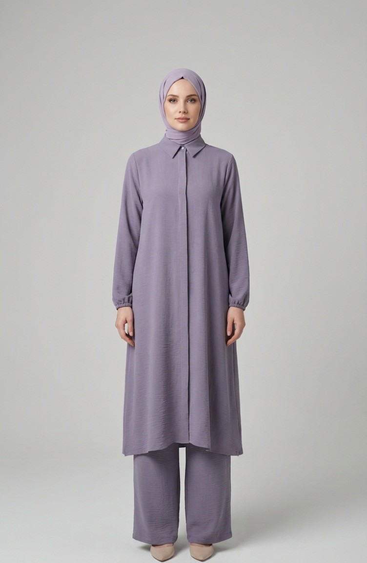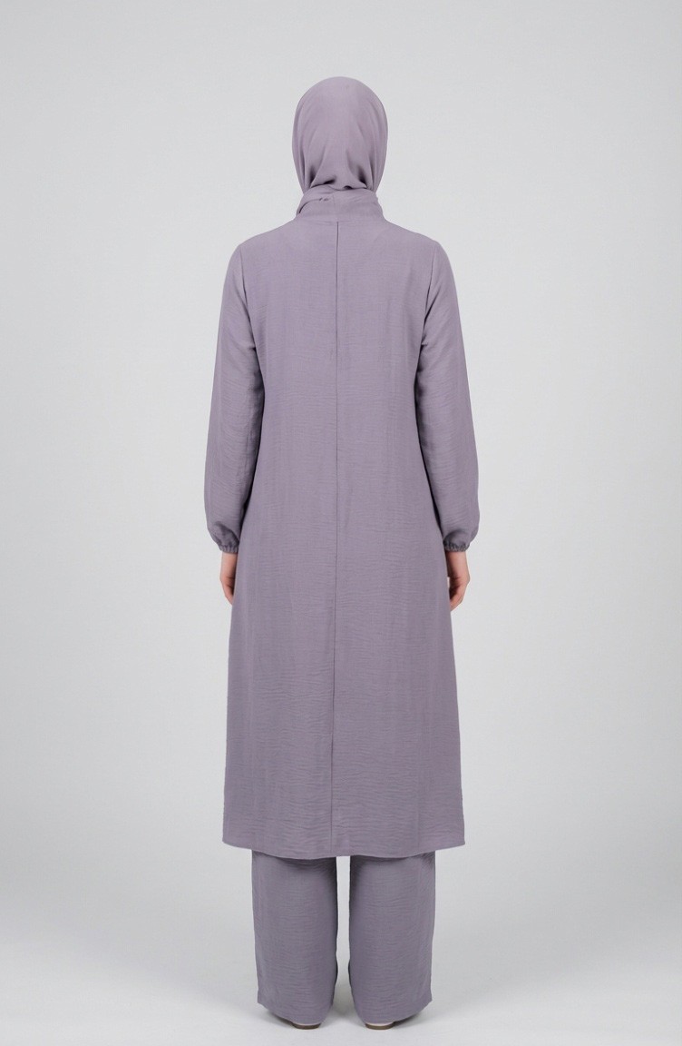 Gray color is used. Aerobin. It has a plain appearance. When the tunic combined with another product, you will get a nice suit. It's made of elastic sleeves. Suitable for 4 seasons. The size worn by the model, is the one on the image.