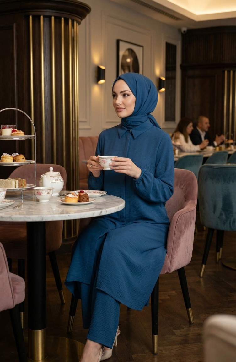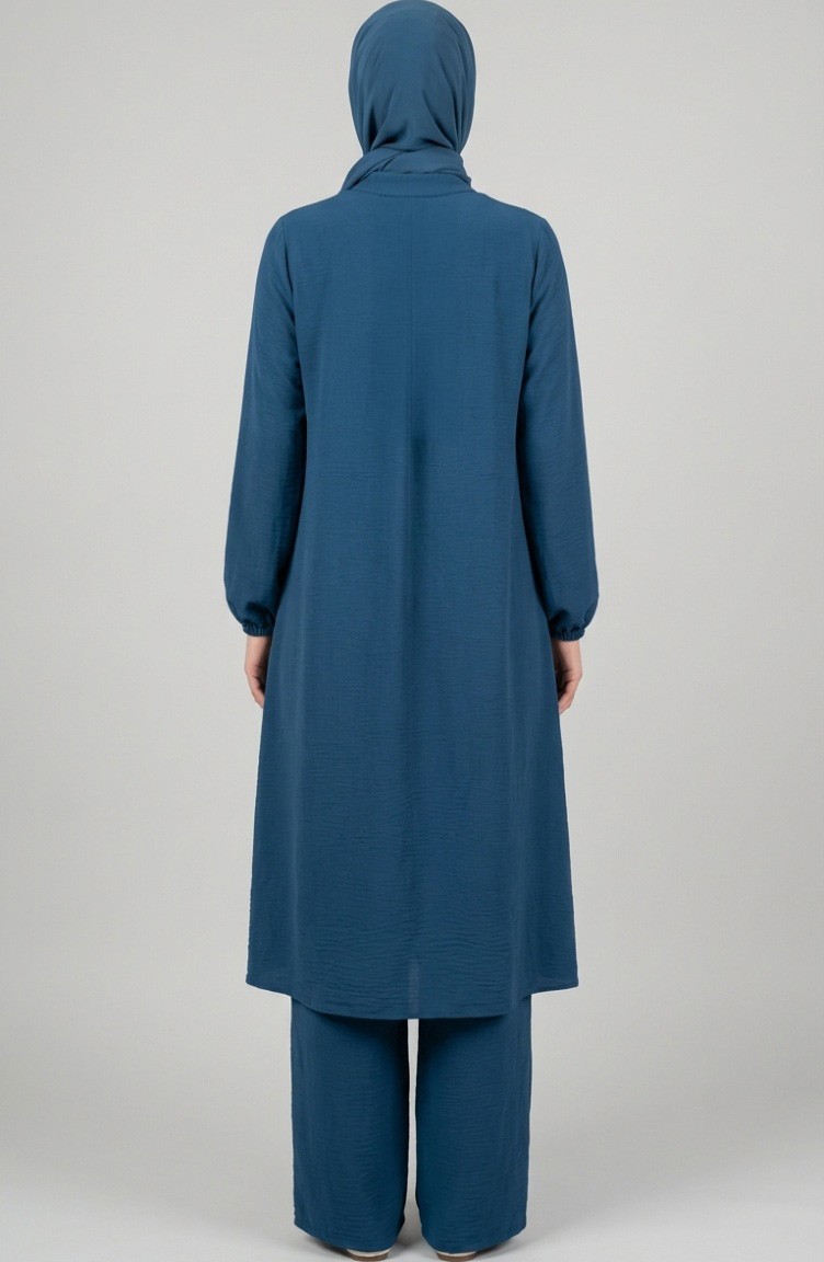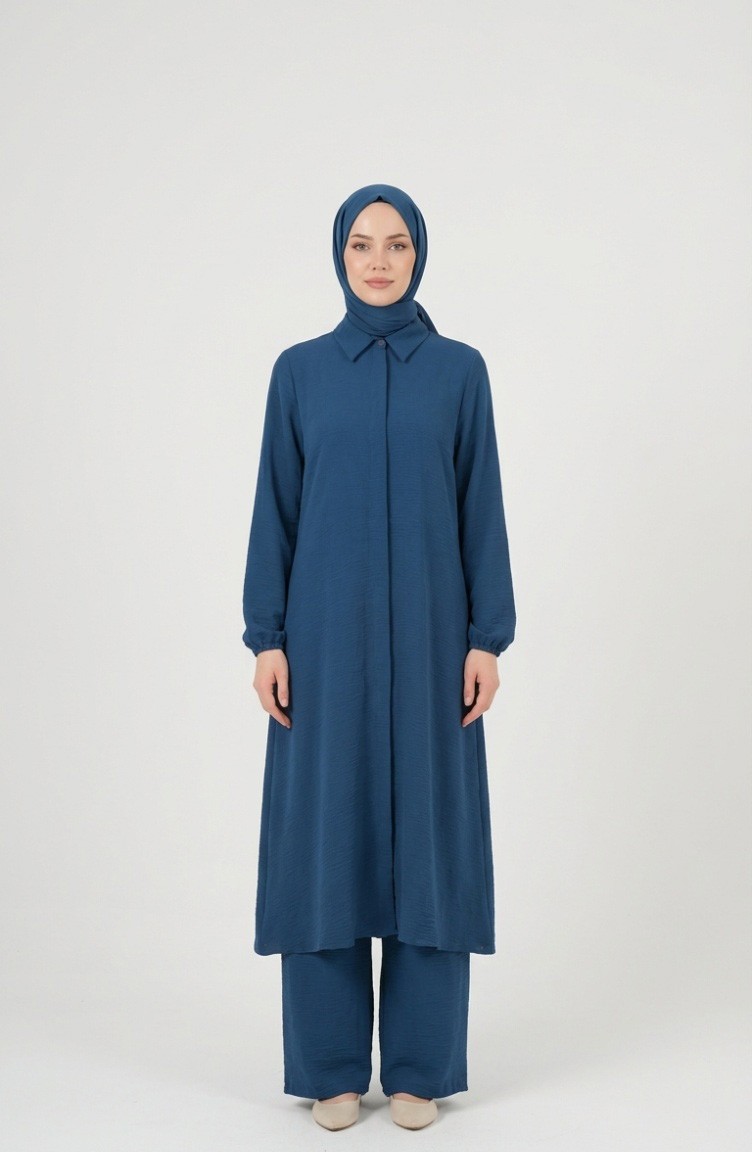 Indigo color is used. Aerobin. It has a plain appearance. When the tunic combined with another product, you will get a nice suit. It's made of elastic sleeves. Suitable for 4 seasons. The size worn by the model, is the one on the image.