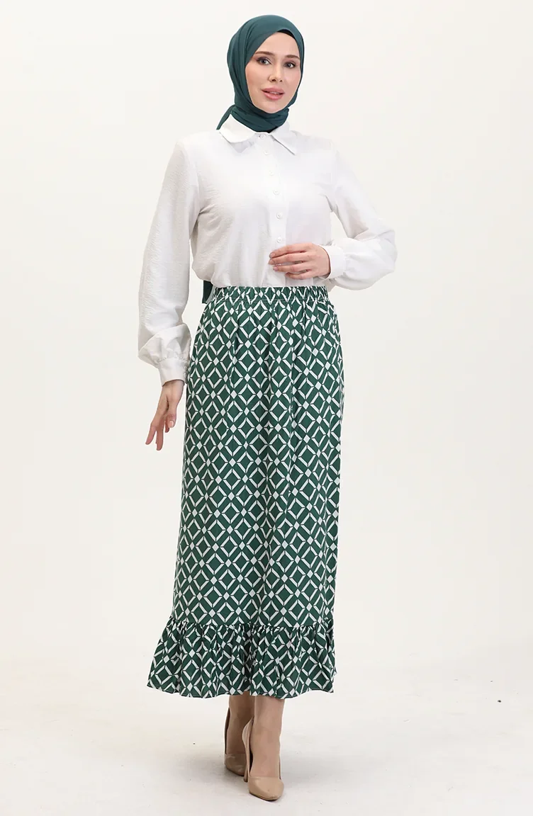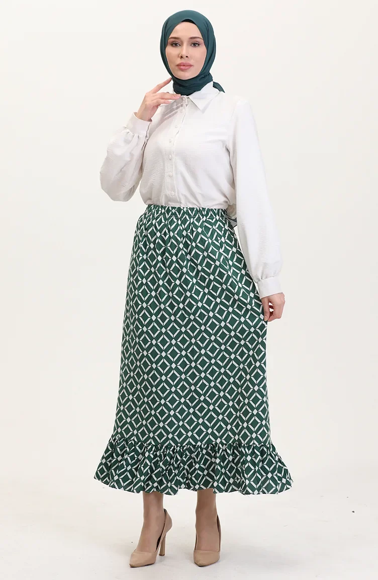 Emerald green color used. Viscose is a type of synthetic fabric and is convenient to use. Designed with patterned fabric. It has ruffle detail. Suitable for 4 seasons. Length is adjusted according to standard size measurements.