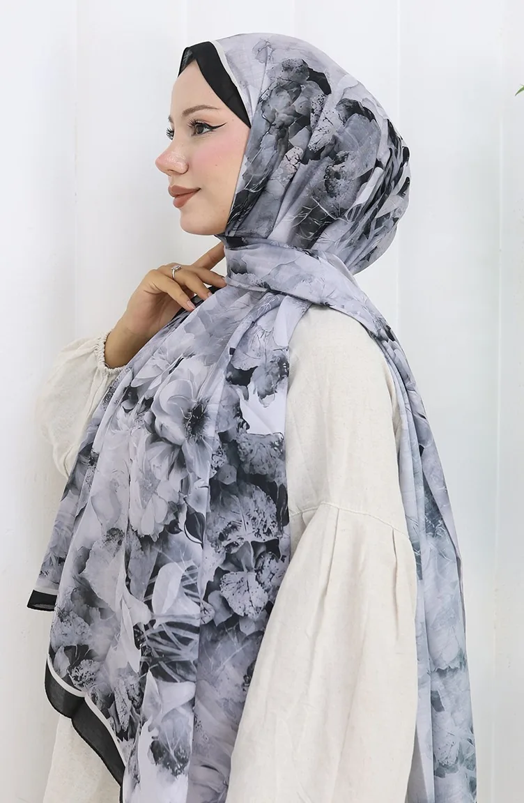 Pamuklu Desenli Koza Şal 70324-06 Siyah Gri