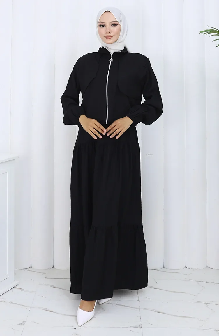 Siyah renktedir. Pamuk dokuma kumaş. Sade. Fermuarlı. Lastik kollu. 4 Mevsim tercih edebilirsiniz. Büyük beden seçeneği mevcuttur.