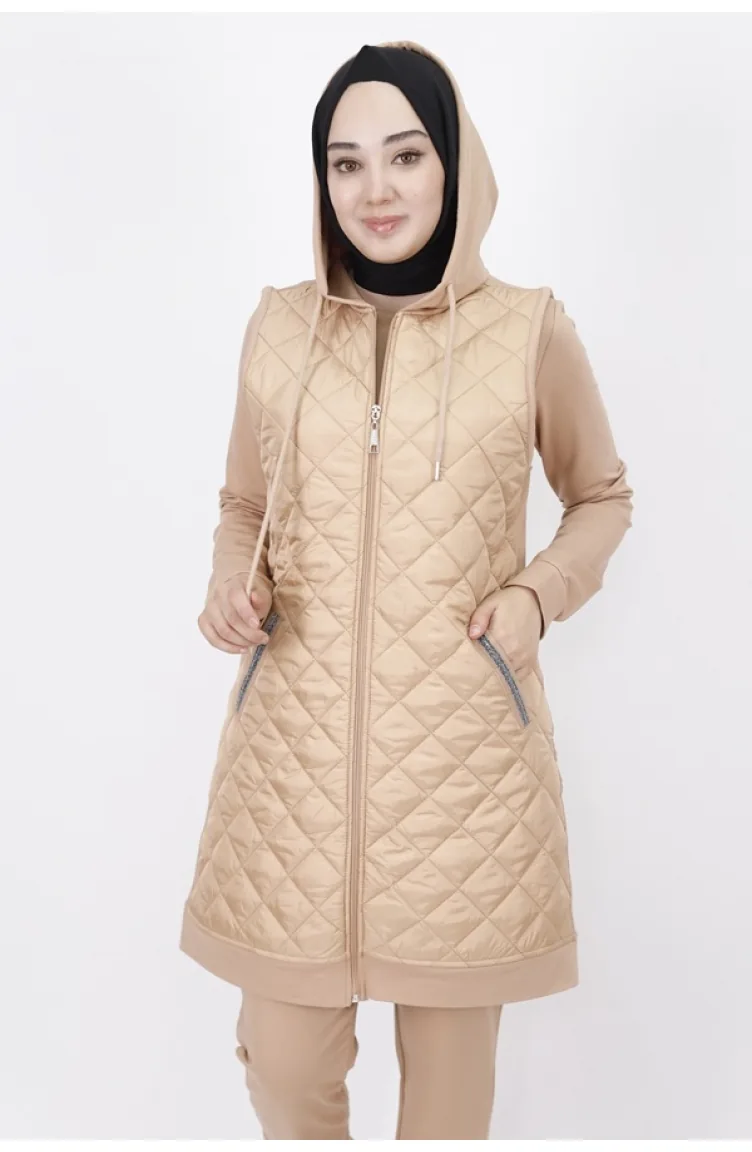 2 ip kumaş ve polyester kumaşlar kullanılmıştır,sweatshirt,pantolon ve yelek olarak 3 lü kombindir.sweatshirt sıfır yaka,yelek kapüşonlu yakadır,mankenin giydiği beden:38,kumaş değerleri;%65 cotton %35 polyester,sweatshirt ölçüleri;göğüs:48,bel:46,basen:56,boy:90cm,pantolon ölçüleri;bel:40,basen:48cm,yelek ölçüleri;göğüs:50,bel:48,basen:54,boy:82cm,mankenin ölçüleri;boy:168cm,göğüs:85,bel:65,basen:90,kilo:55