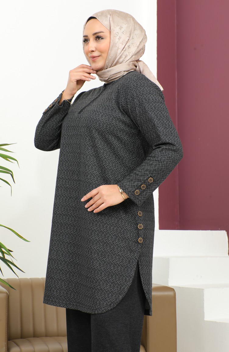 Astarsız Düğme detaylı takım. Pantolon siyah renk ecrin kumaştır, tunik desenli jakar örme kumaş. Büyük beden seçeneği mevcuttur.