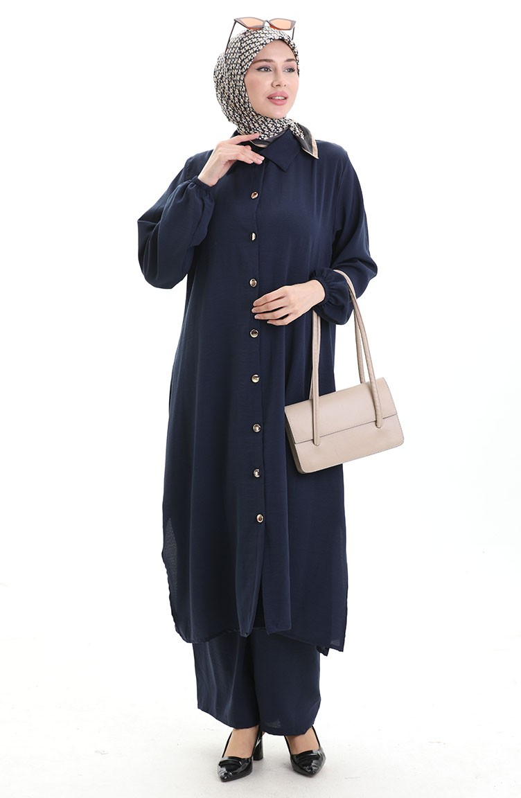 Düğmeli Uzun Tunik Pantolon İkili Takım 0089-03 Lacivert