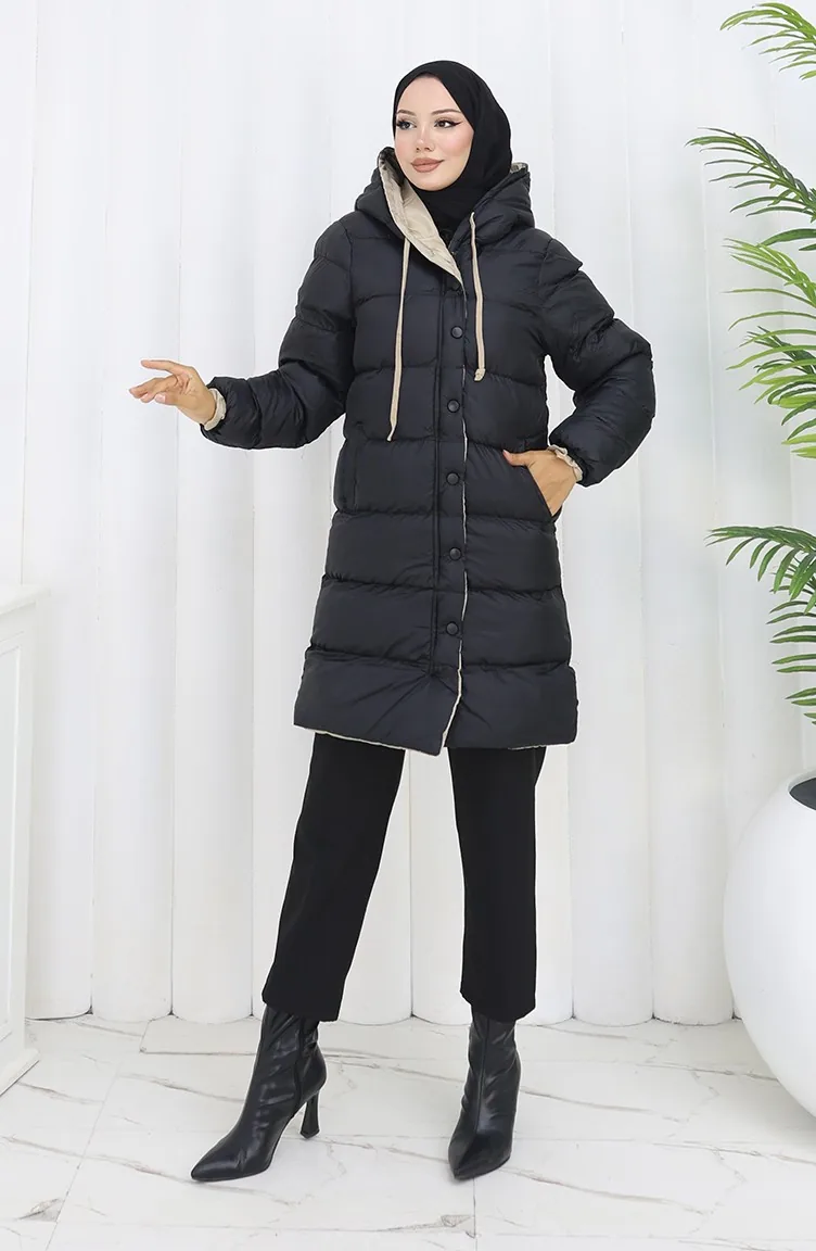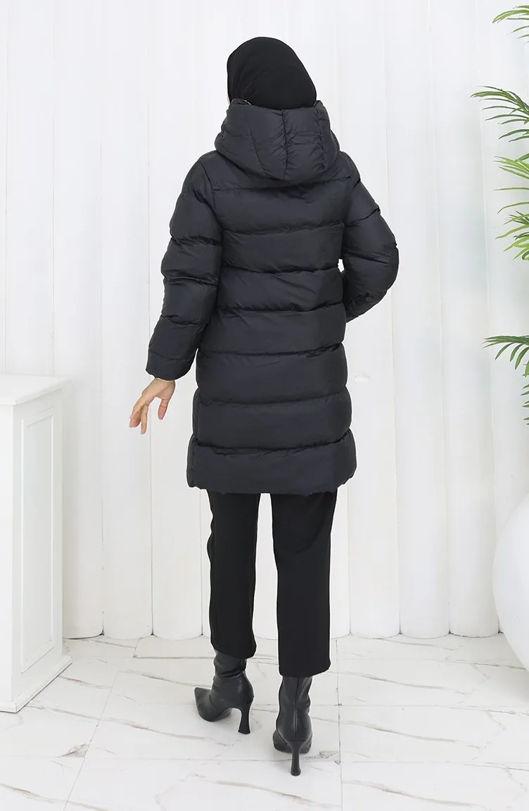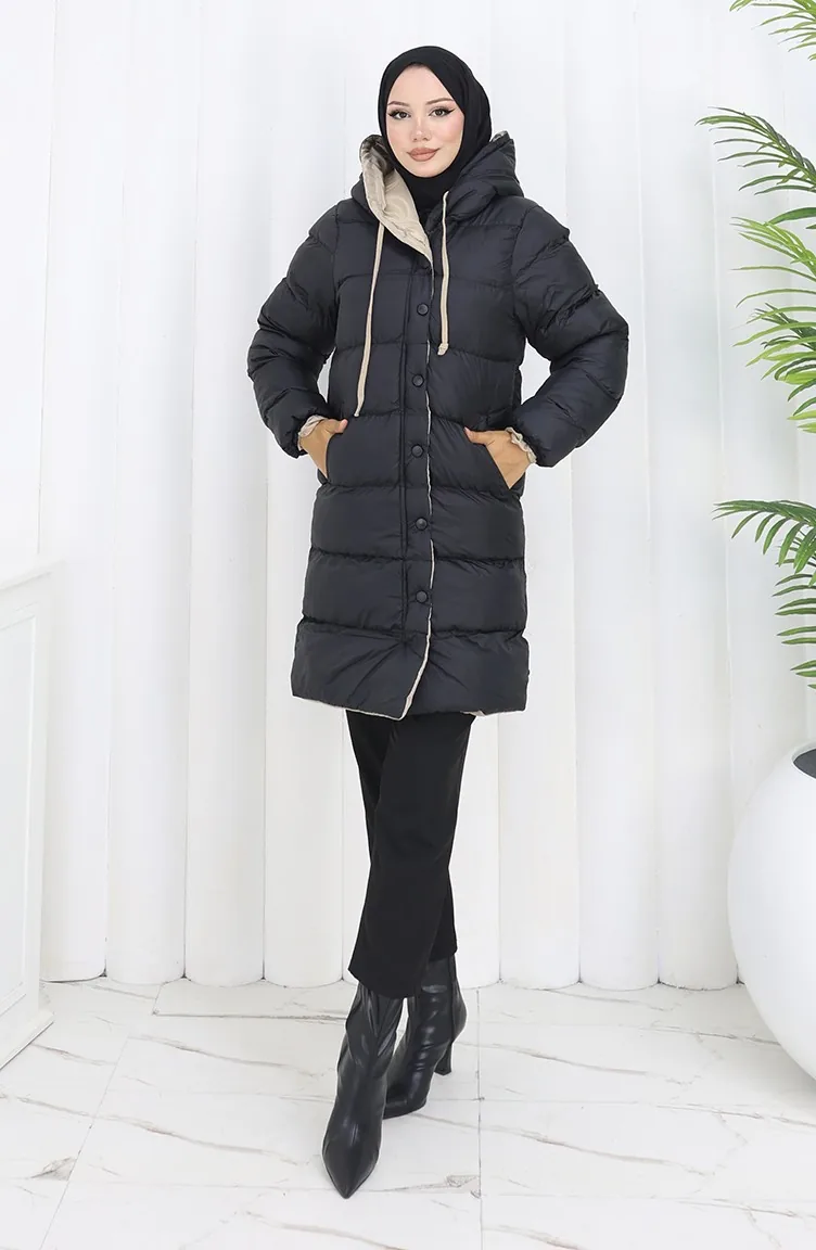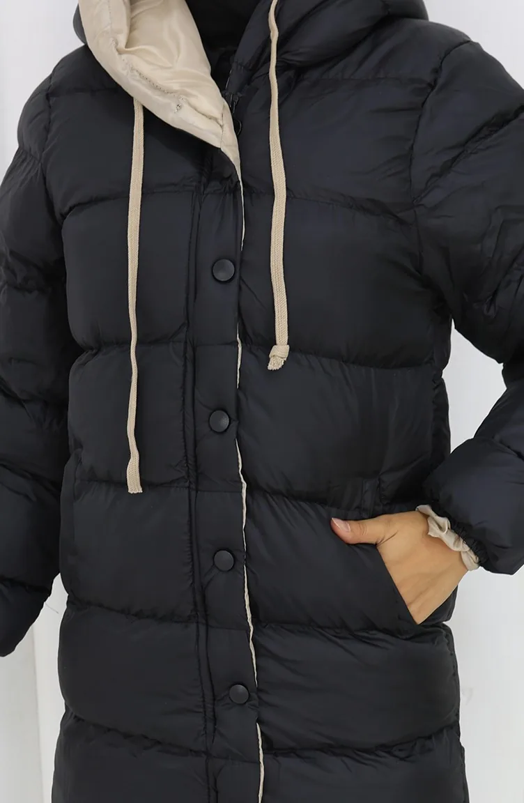 Kapüşonlu Düğmeli Şişme Mont 0167-01 Siyah