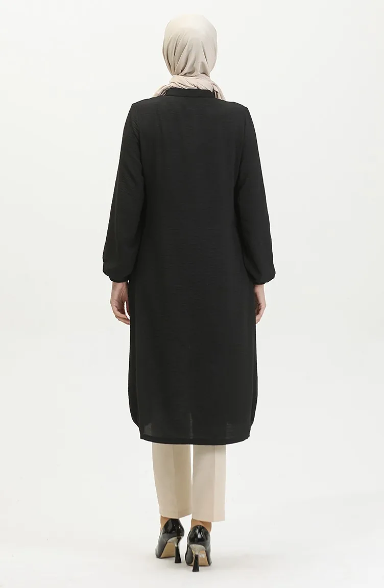 Siyah renktedir. Polyester kumaş. Sade. Pul detaylı. Lastik kollu. Hakim yaka detayı ile kullanışlı modeldir. Mevsimlik. Büyük beden seçeneği mevcuttur.