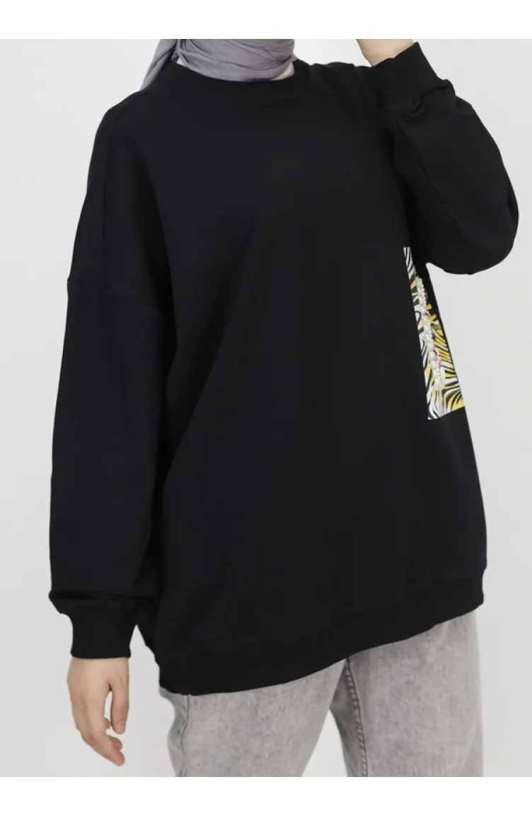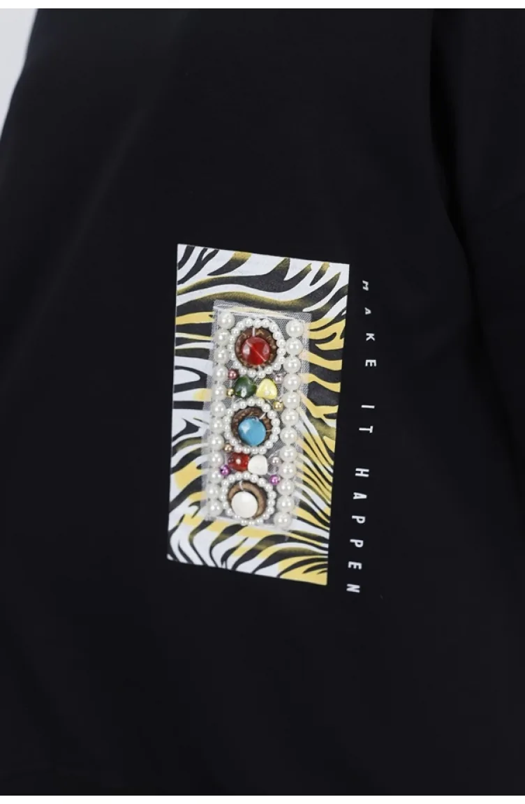2 İp Kumaş İnci Ve Baskı Detaylı Oversize Sweatshirt 23001-03 Siyah