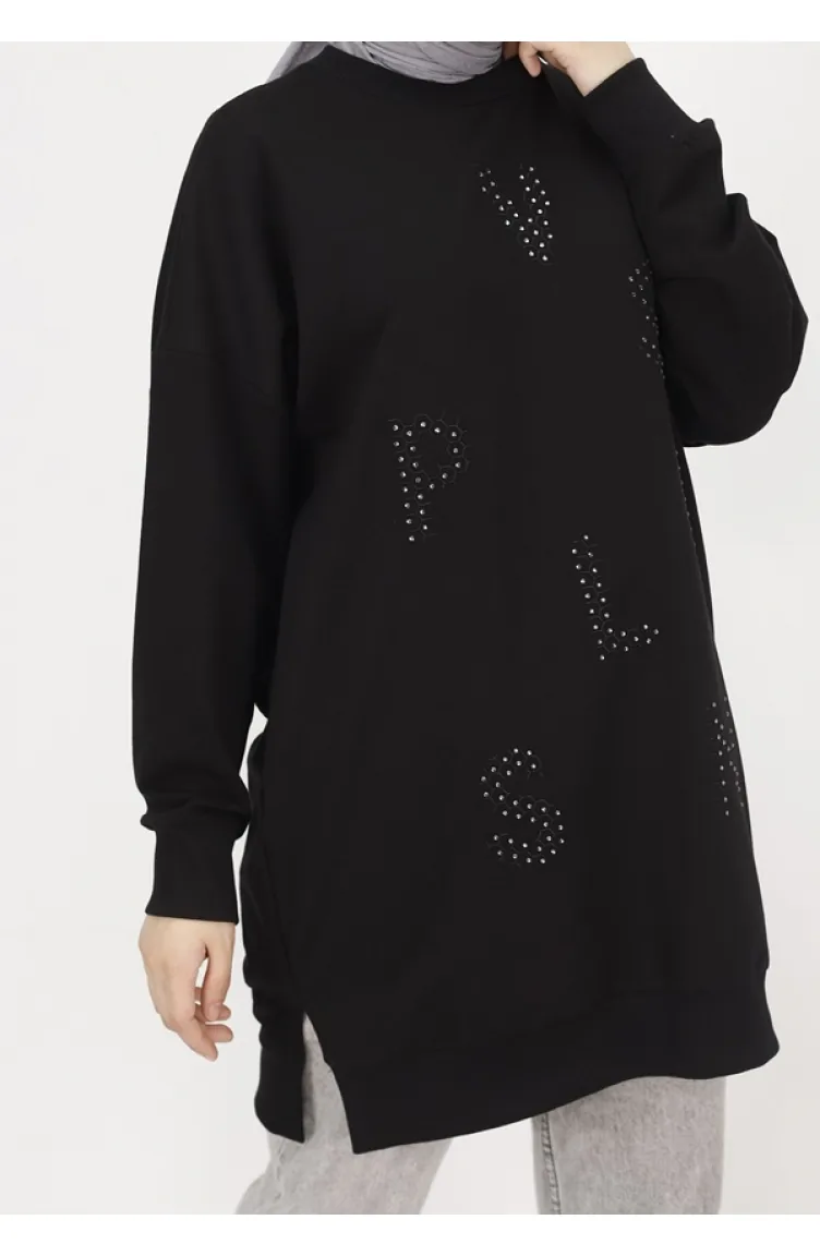 Puane 2 İp Kumaş Taş Baskılı Sweatshirt 10347-01 Siyah