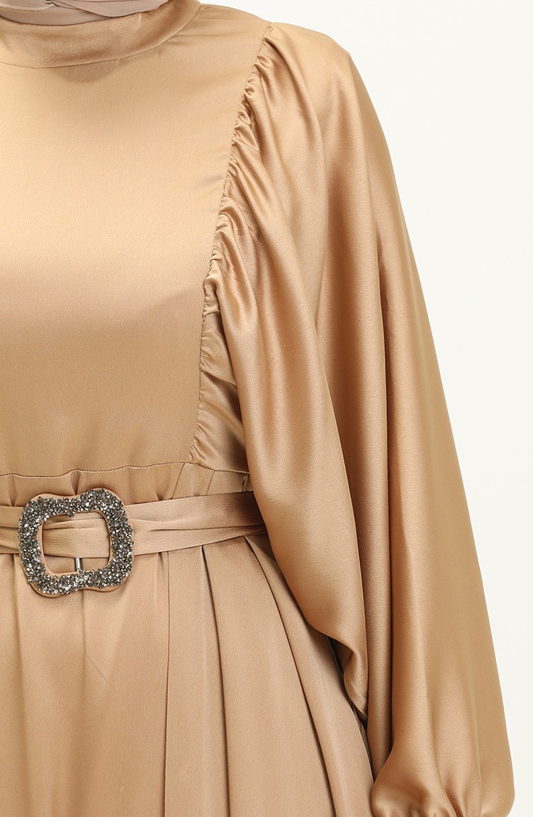 Balon Kol Saten Abiye Elbise 6020-01 Camel