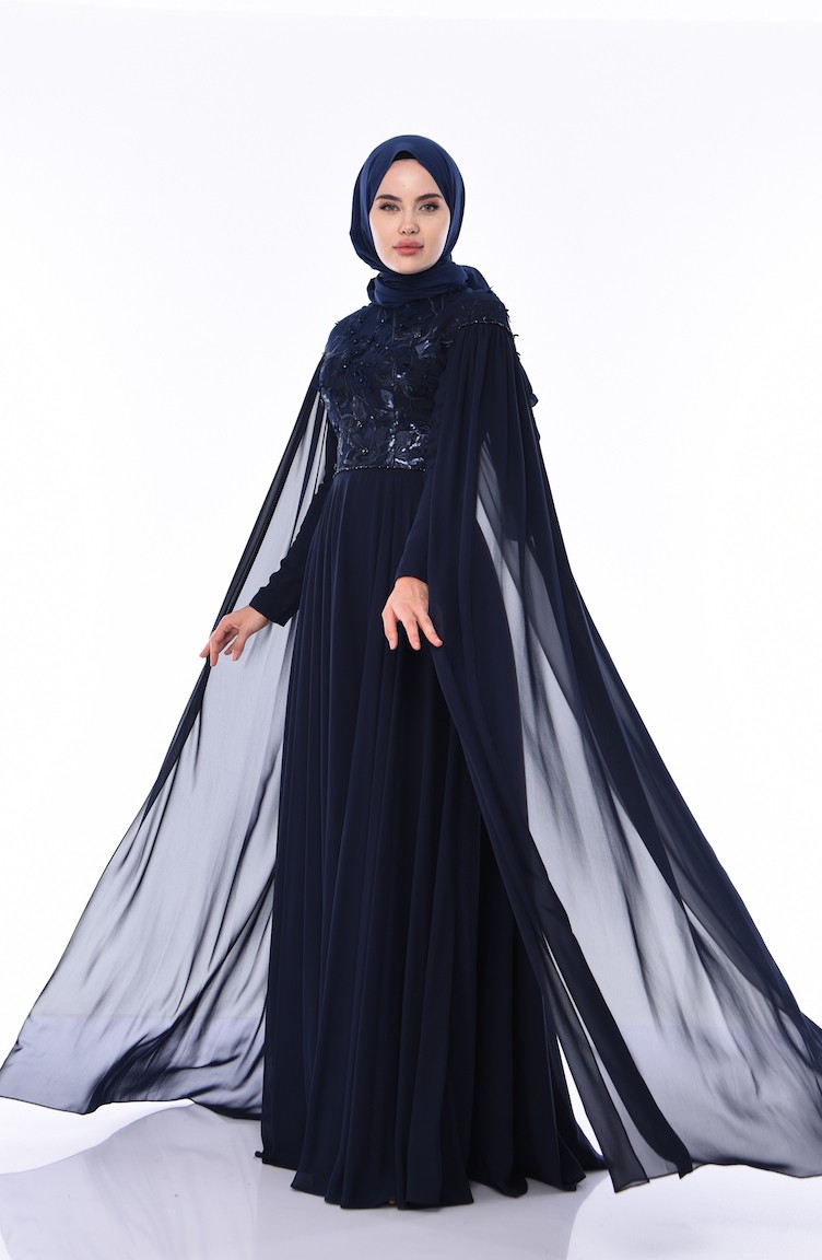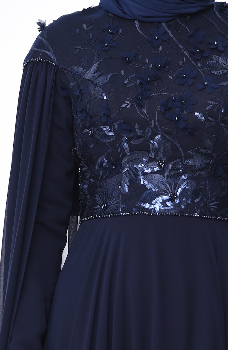 Boncuk İşlemeli Abiye Elbise 4574-02 Lacivert